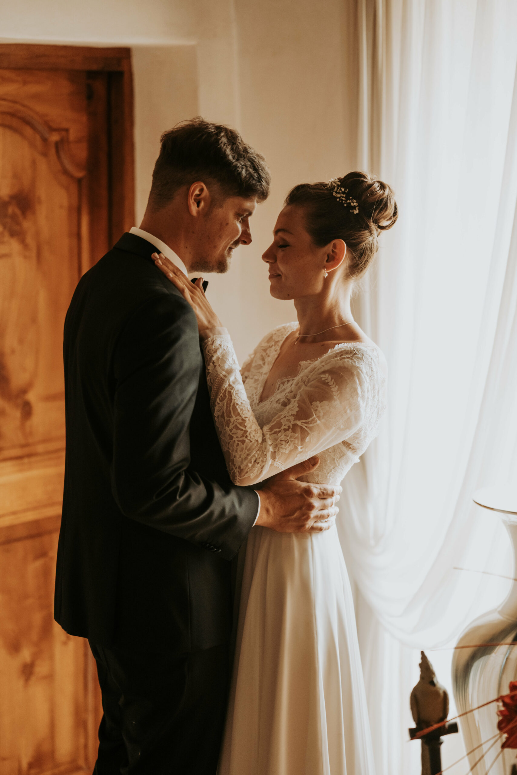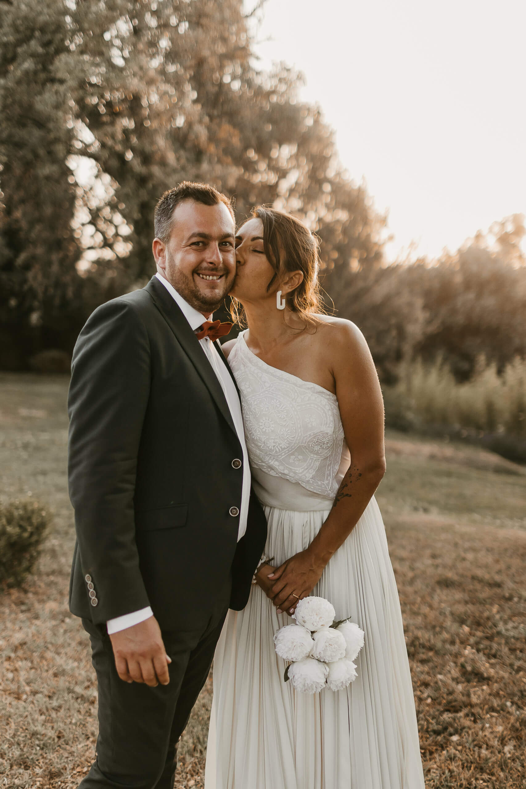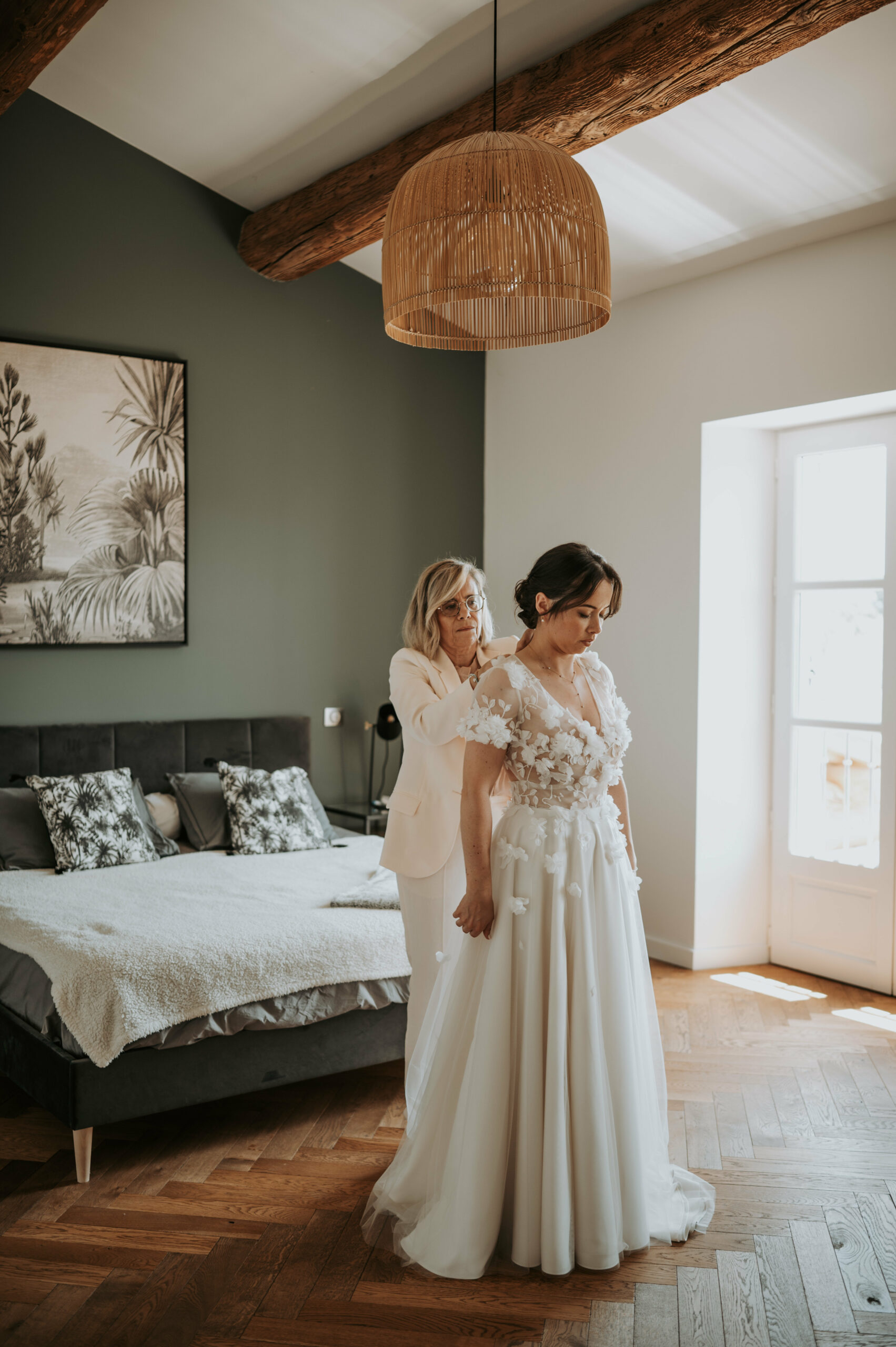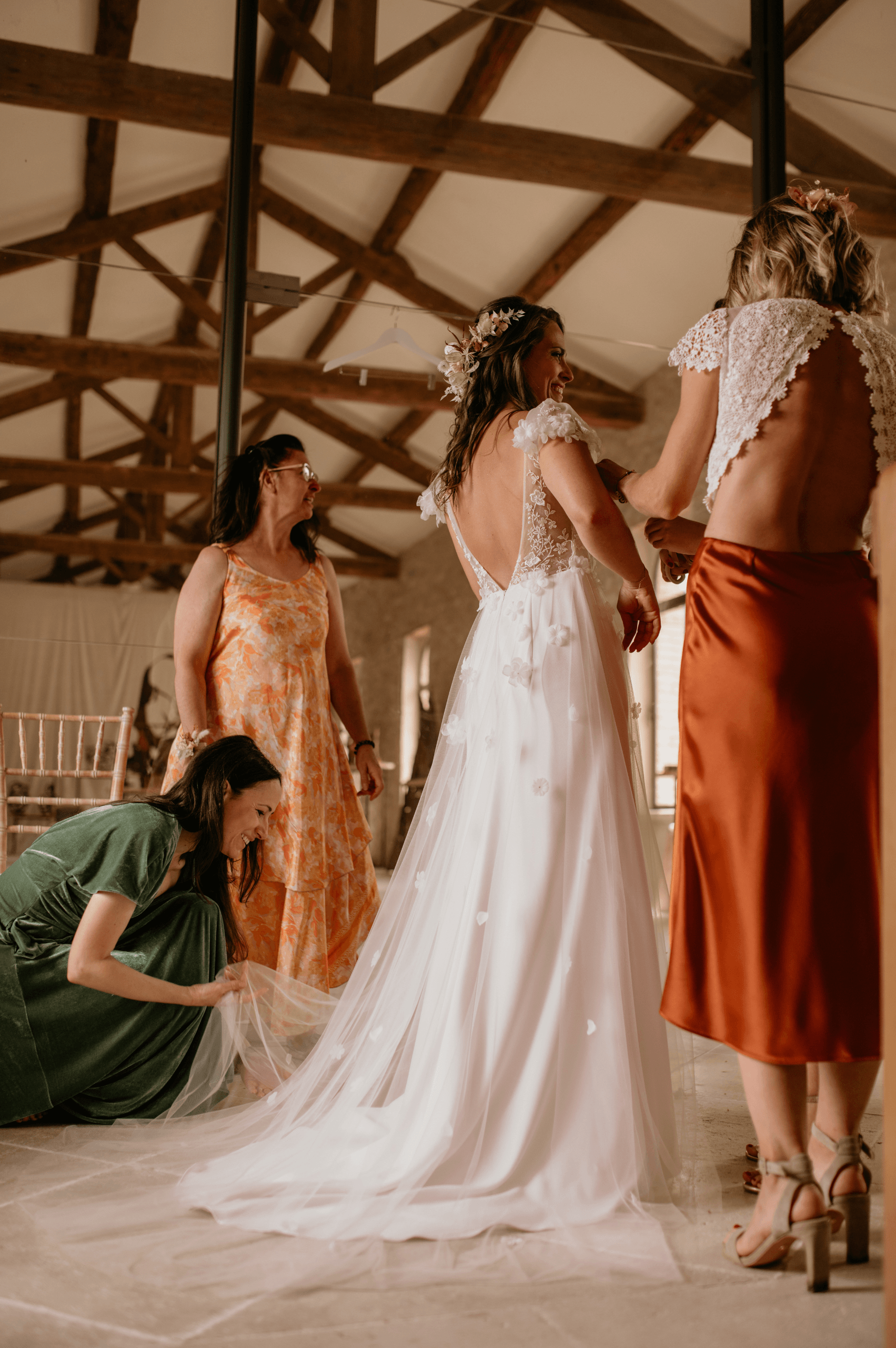Pour révéler la personnalité solaire et audacieuse de Magali, nous avons imaginé des pièces fortes pour chaque instant de son Jour J. Des manches bouffantes en taffetas de soie pour une allure résolument mode à la mairie, un voile fleuri et coloré où chaque pétale est cousue main pour une entrée romantique à l’église, et enfin une robe somptueusement rebrodée de fleurs éclatantes, pensée pour la rendre inoubliable.