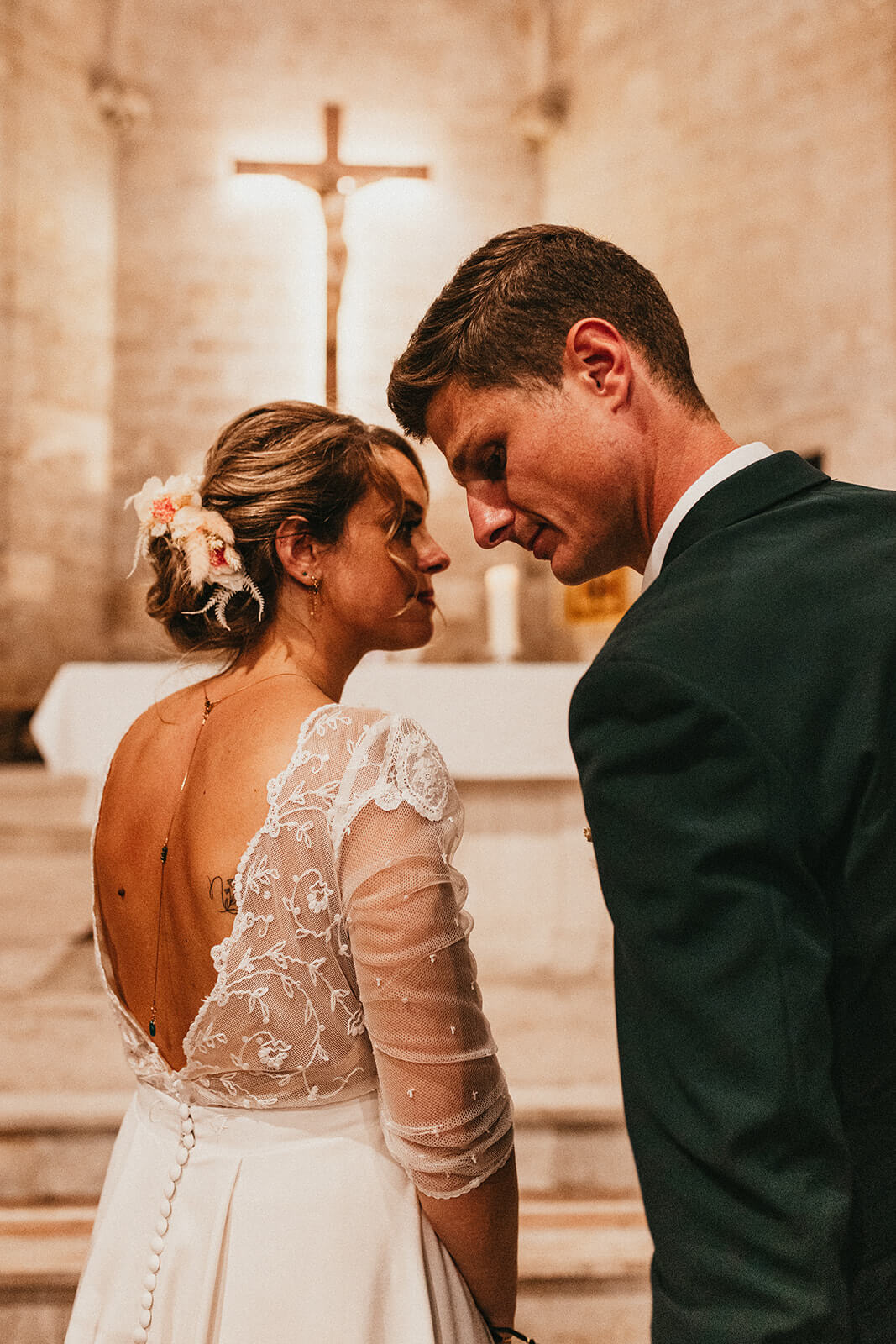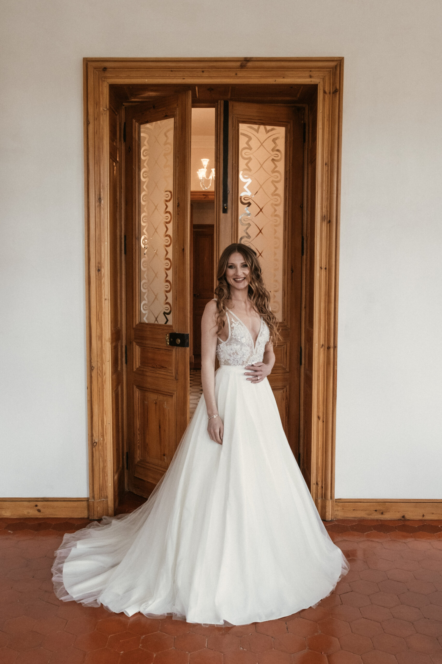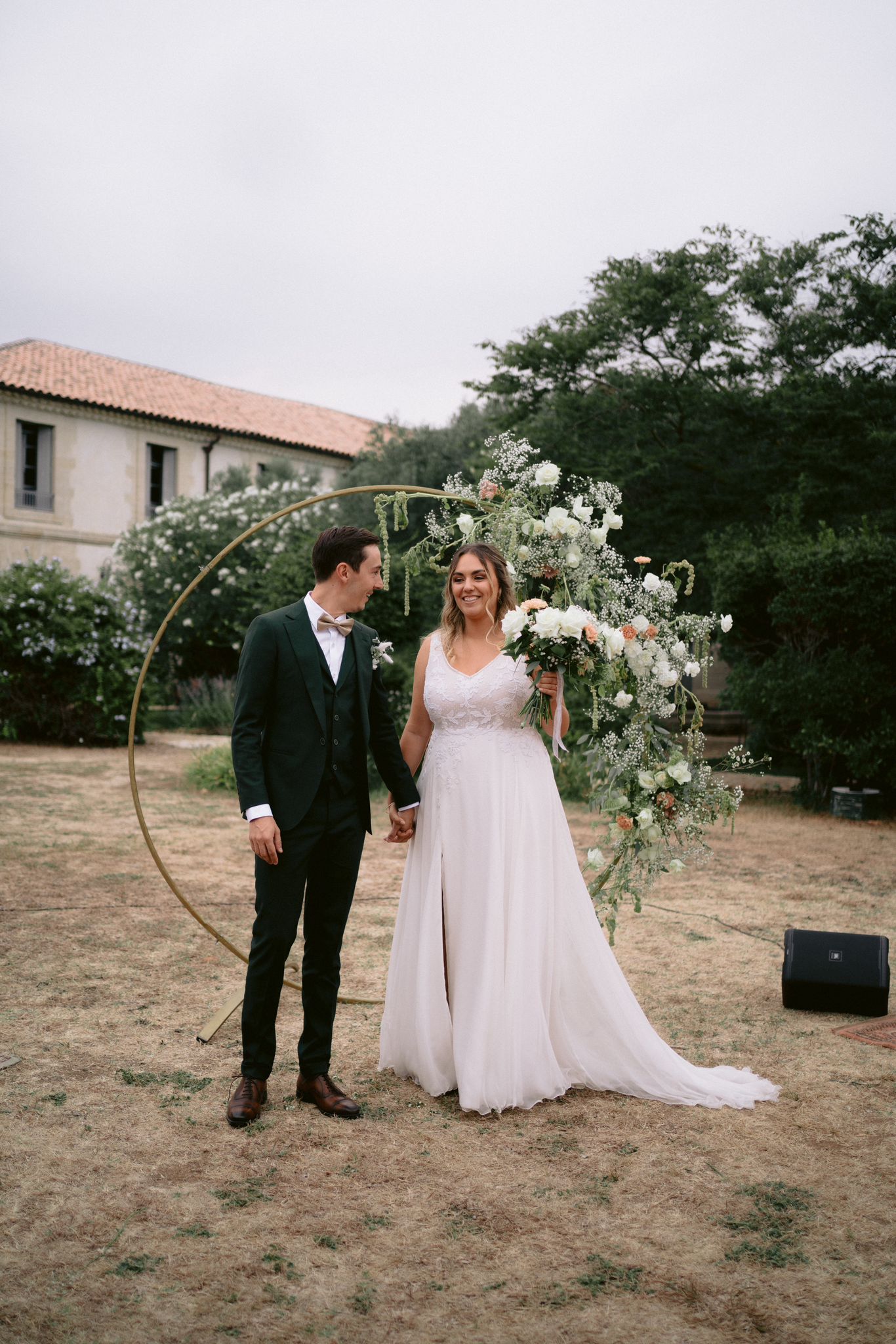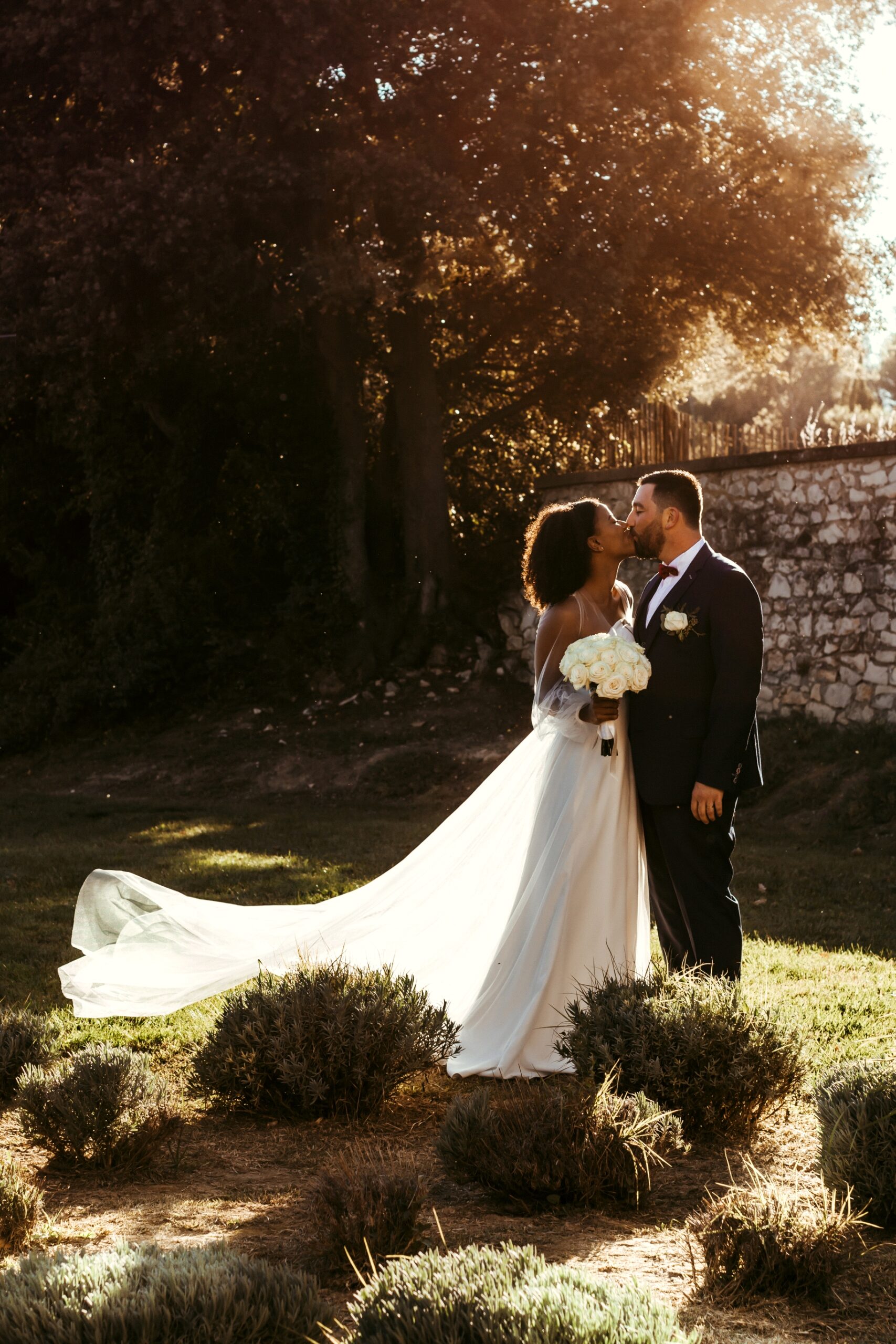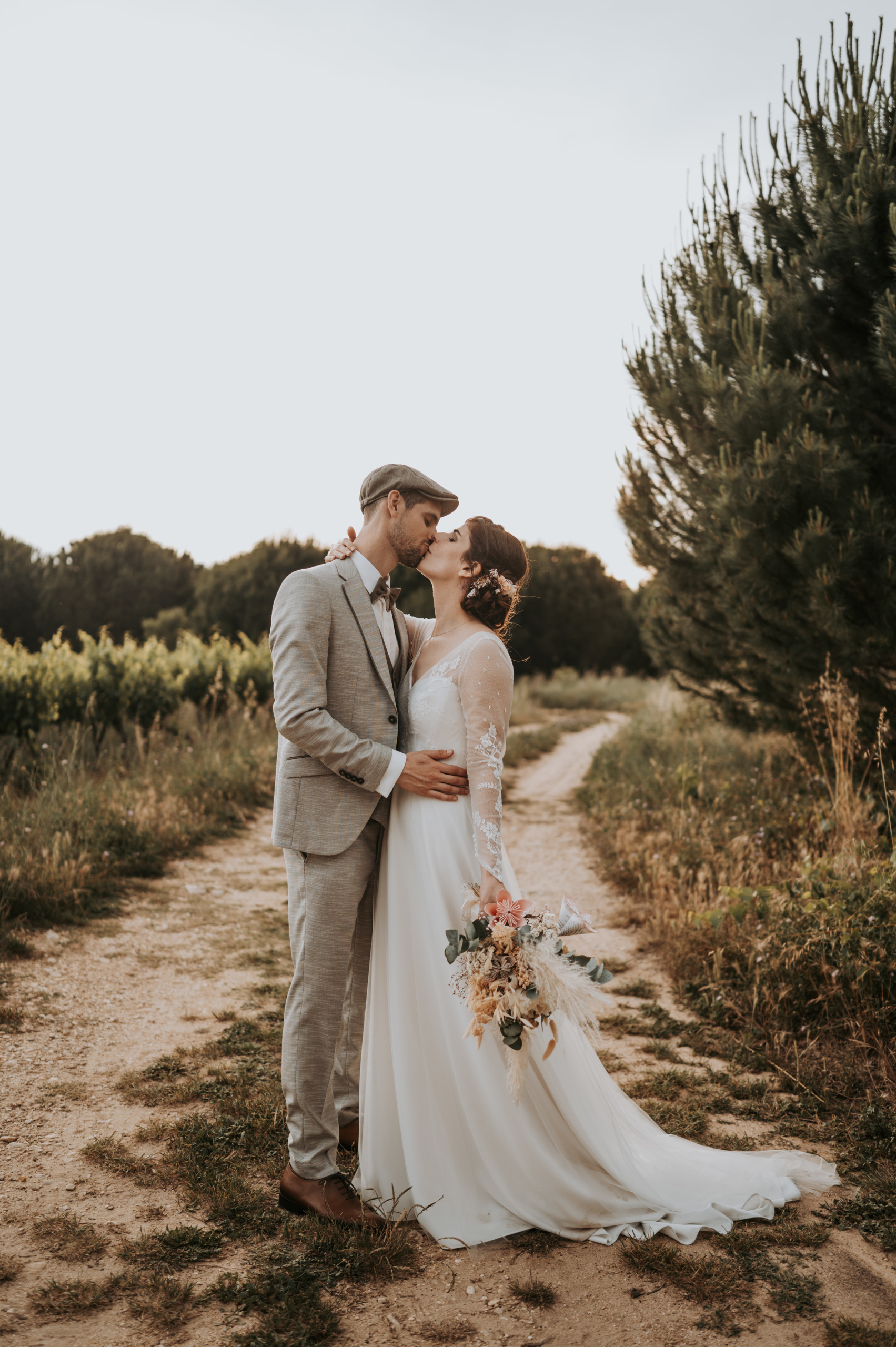 Pour révéler la personnalité solaire et audacieuse de Magali, nous avons imaginé des pièces fortes pour chaque instant de son Jour J. Des manches bouffantes en taffetas de soie pour une allure résolument mode à la mairie, un voile fleuri et coloré où chaque pétale est cousue main pour une entrée romantique à l’église, et enfin une robe somptueusement rebrodée de fleurs éclatantes, pensée pour la rendre inoubliable.
