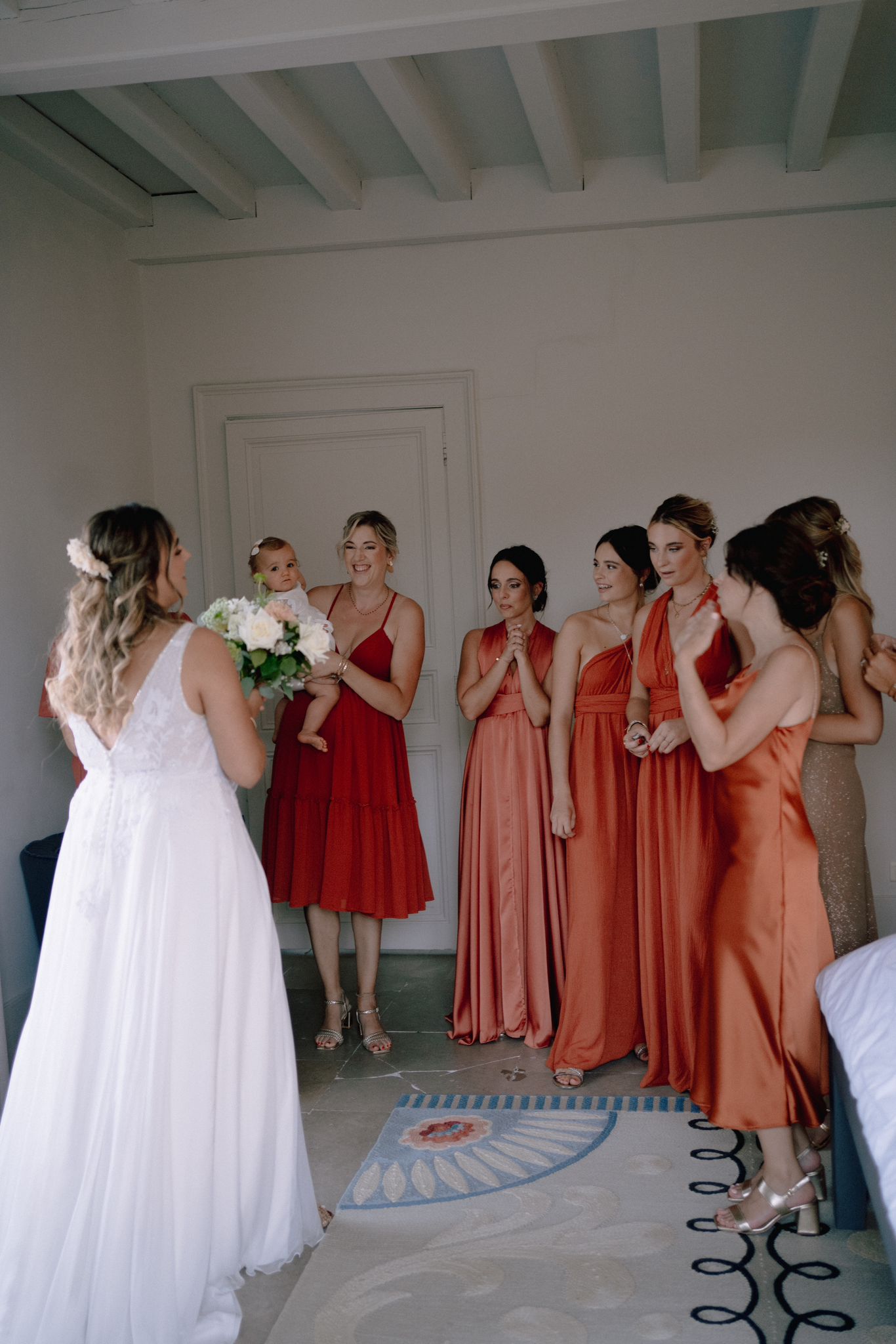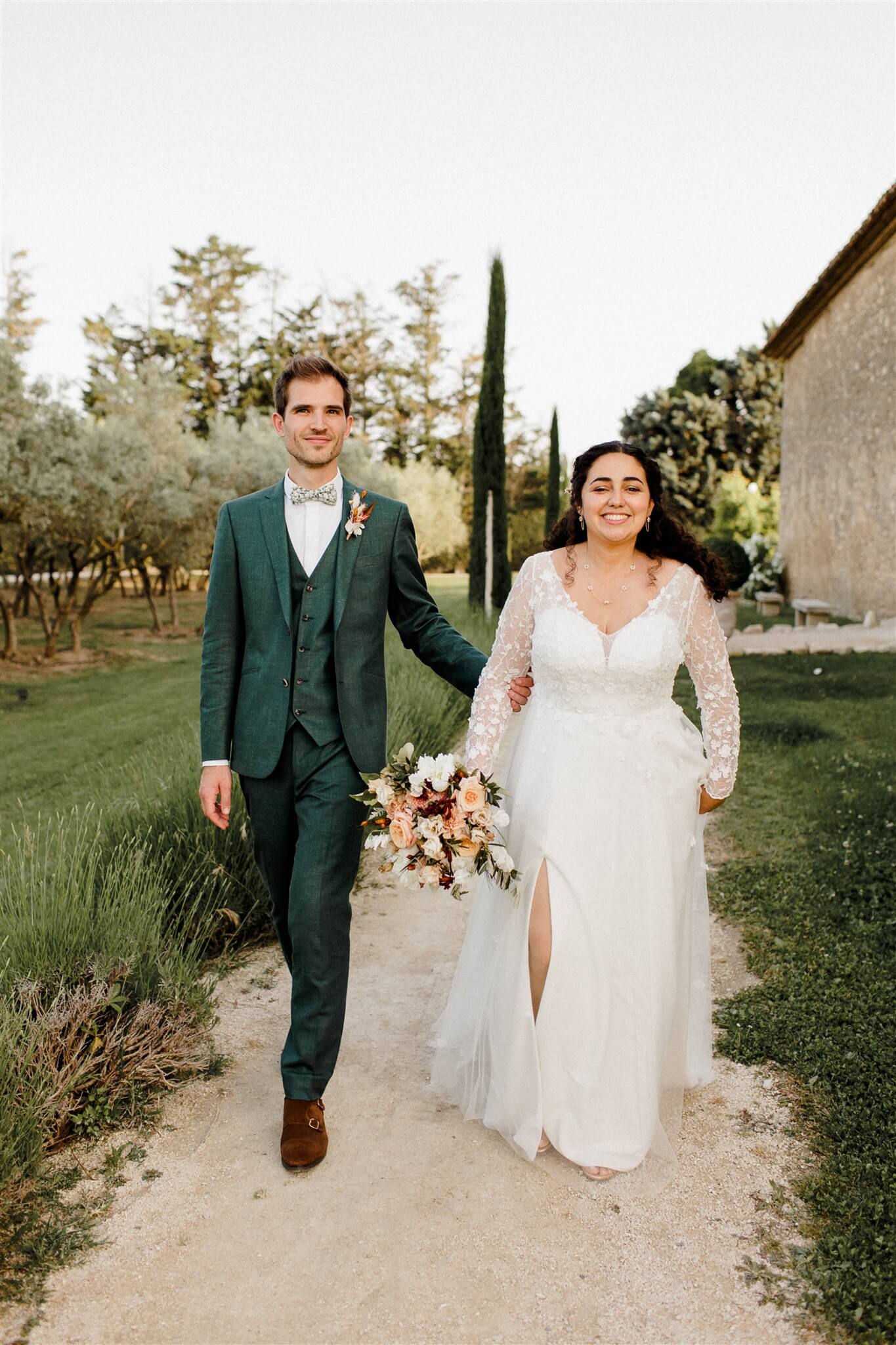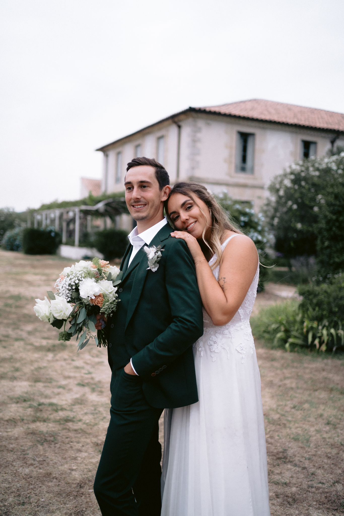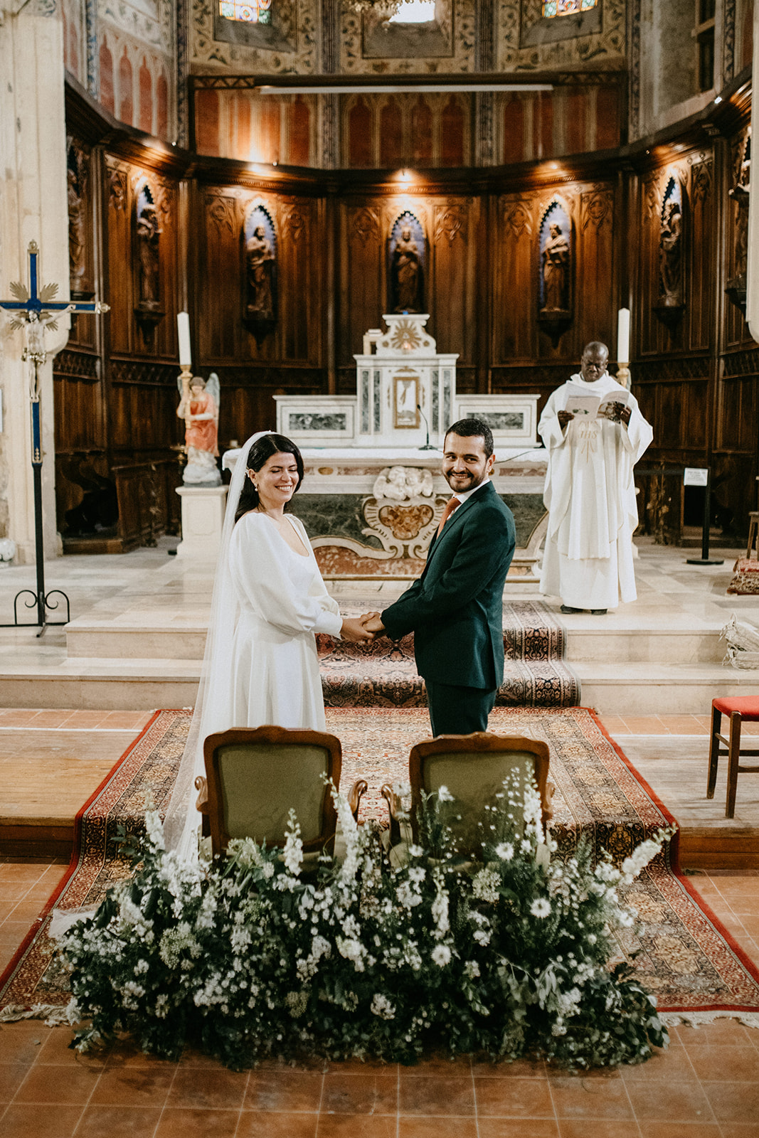 Pour révéler la personnalité solaire et audacieuse de Magali, nous avons imaginé des pièces fortes pour chaque instant de son Jour J. Des manches bouffantes en taffetas de soie pour une allure résolument mode à la mairie, un voile fleuri et coloré où chaque pétale est cousue main pour une entrée romantique à l’église, et enfin une robe somptueusement rebrodée de fleurs éclatantes, pensée pour la rendre inoubliable.