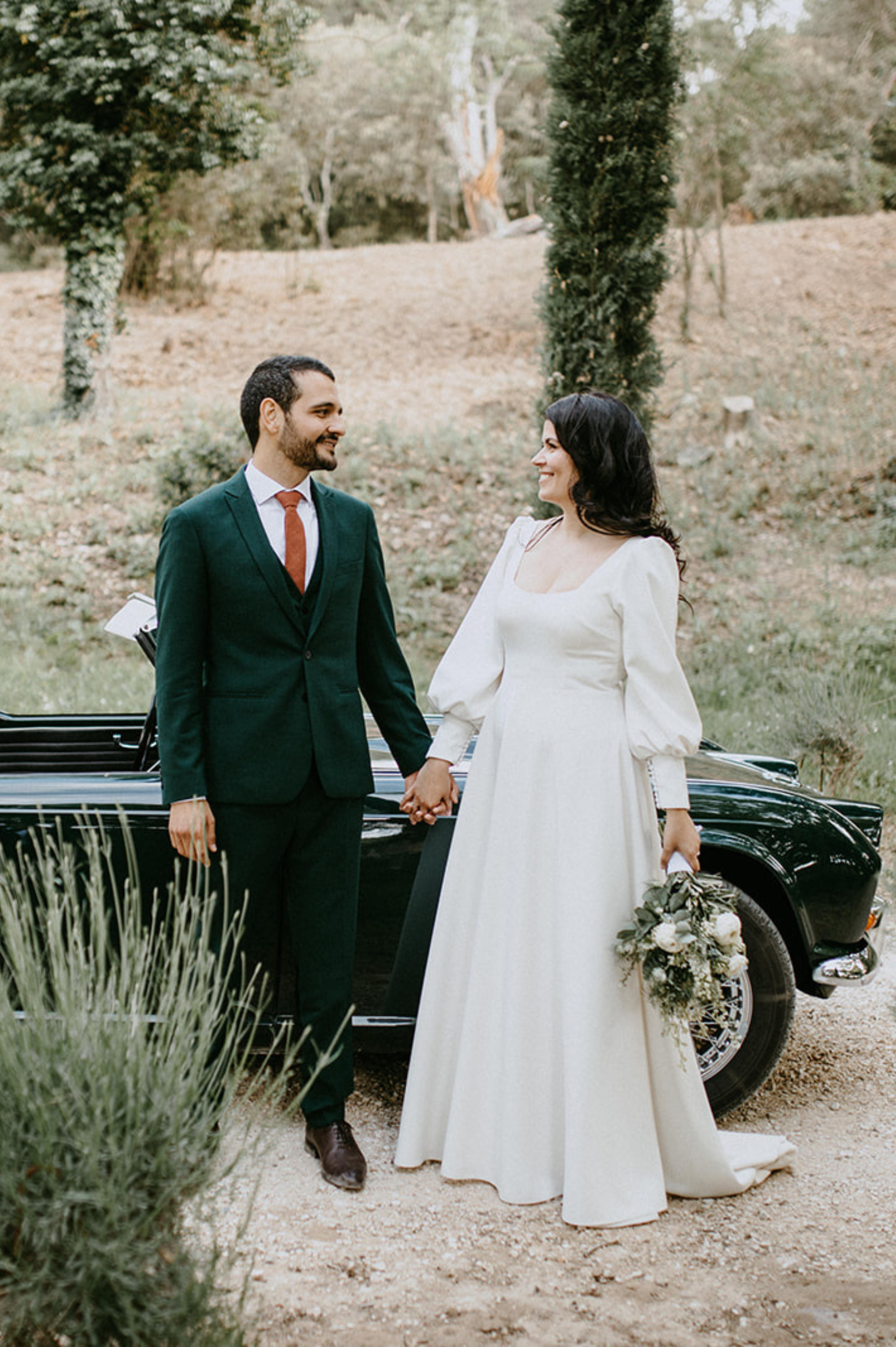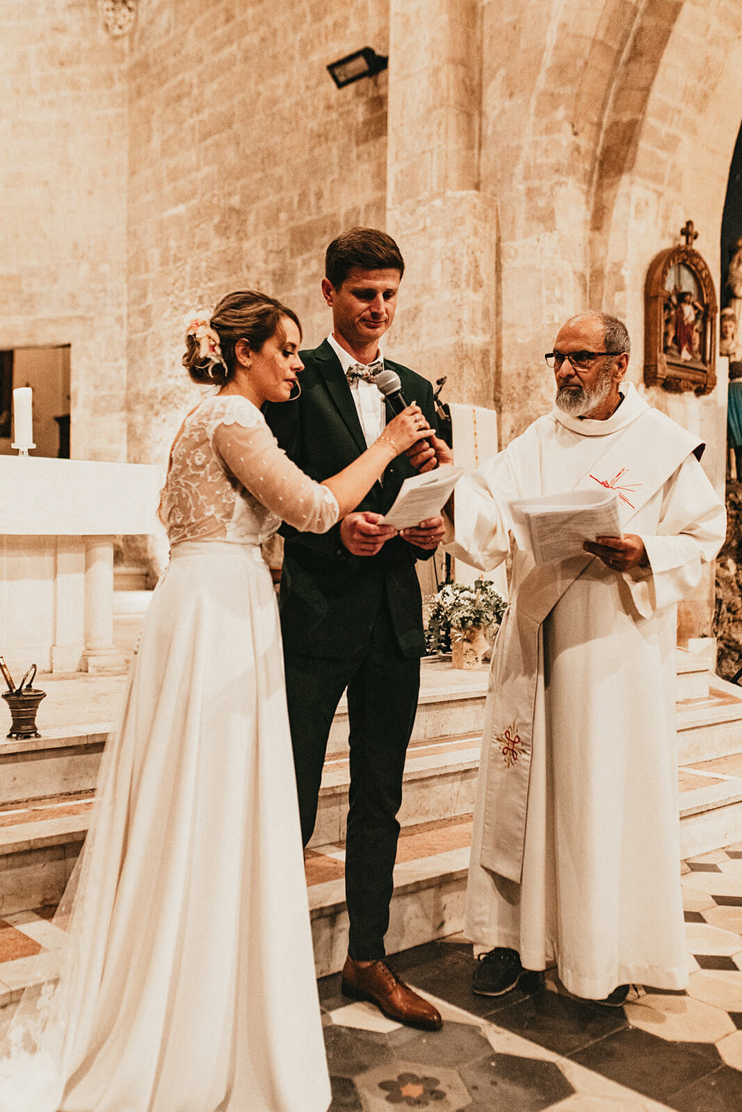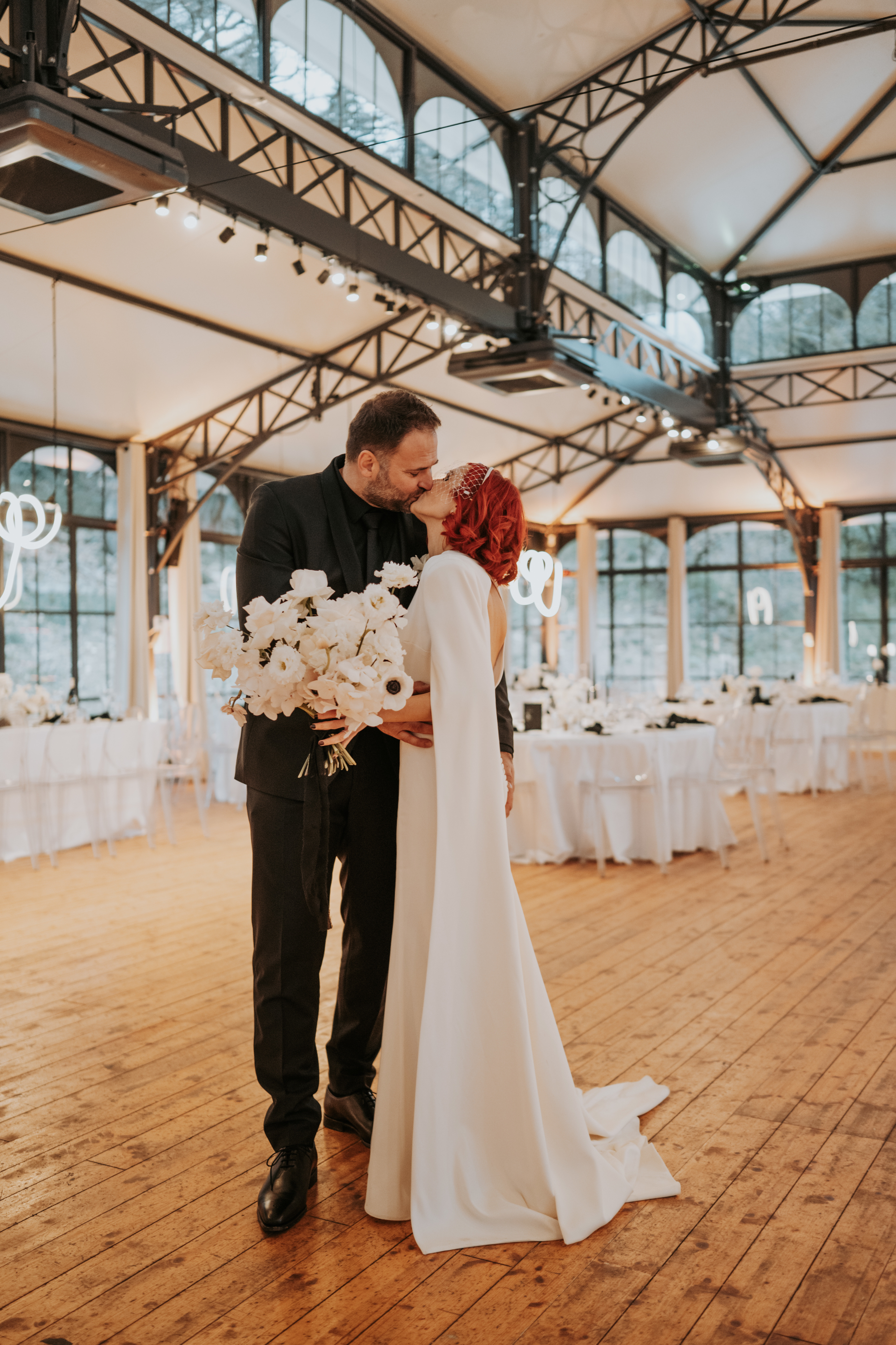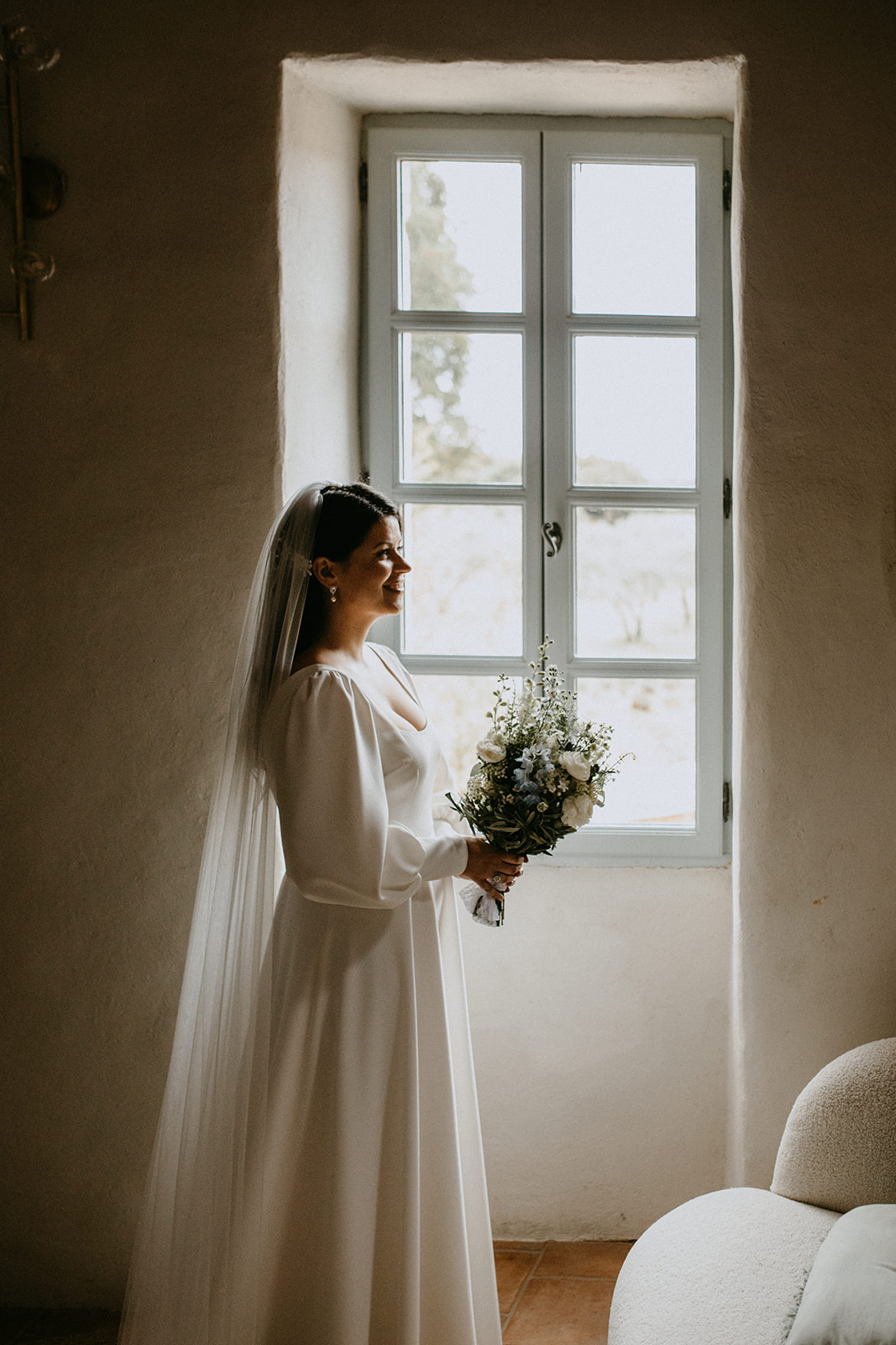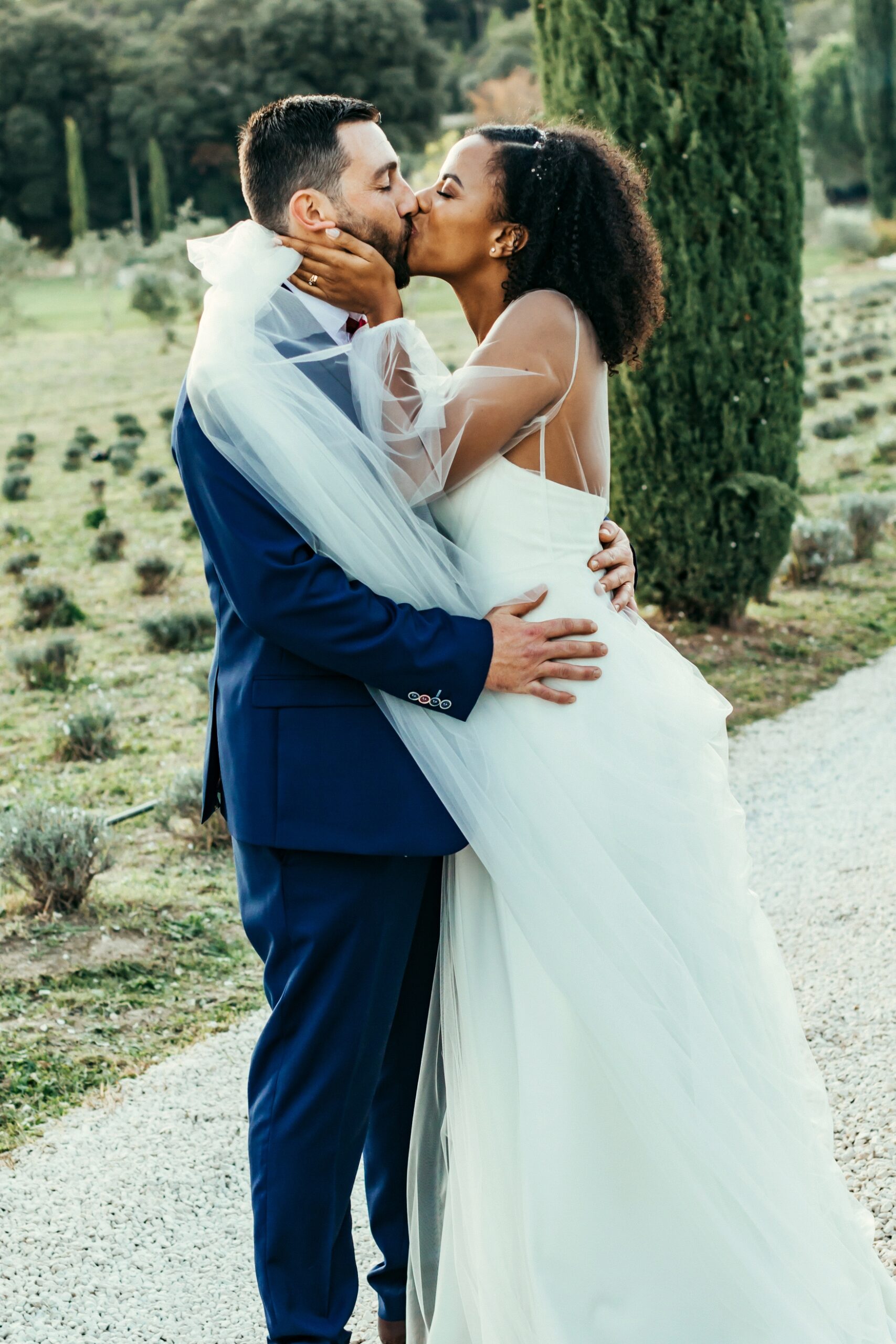 Pour révéler la personnalité solaire et audacieuse de Magali, nous avons imaginé des pièces fortes pour chaque instant de son Jour J. Des manches bouffantes en taffetas de soie pour une allure résolument mode à la mairie, un voile fleuri et coloré où chaque pétale est cousue main pour une entrée romantique à l’église, et enfin une robe somptueusement rebrodée de fleurs éclatantes, pensée pour la rendre inoubliable.