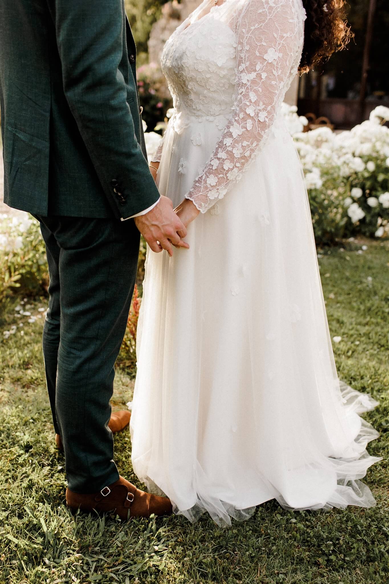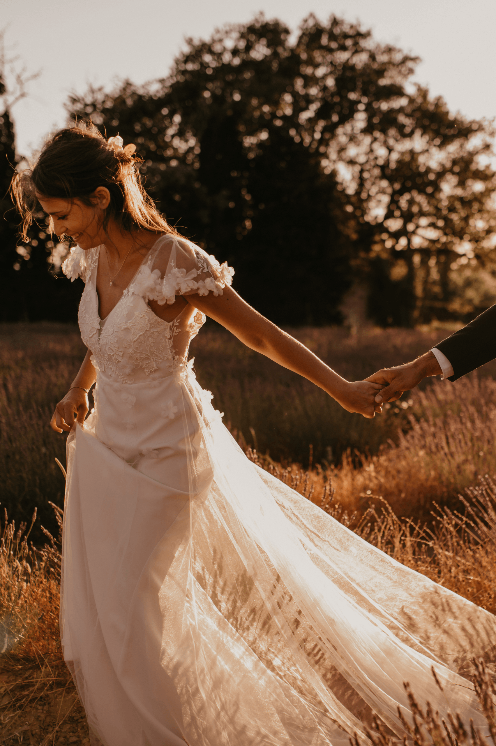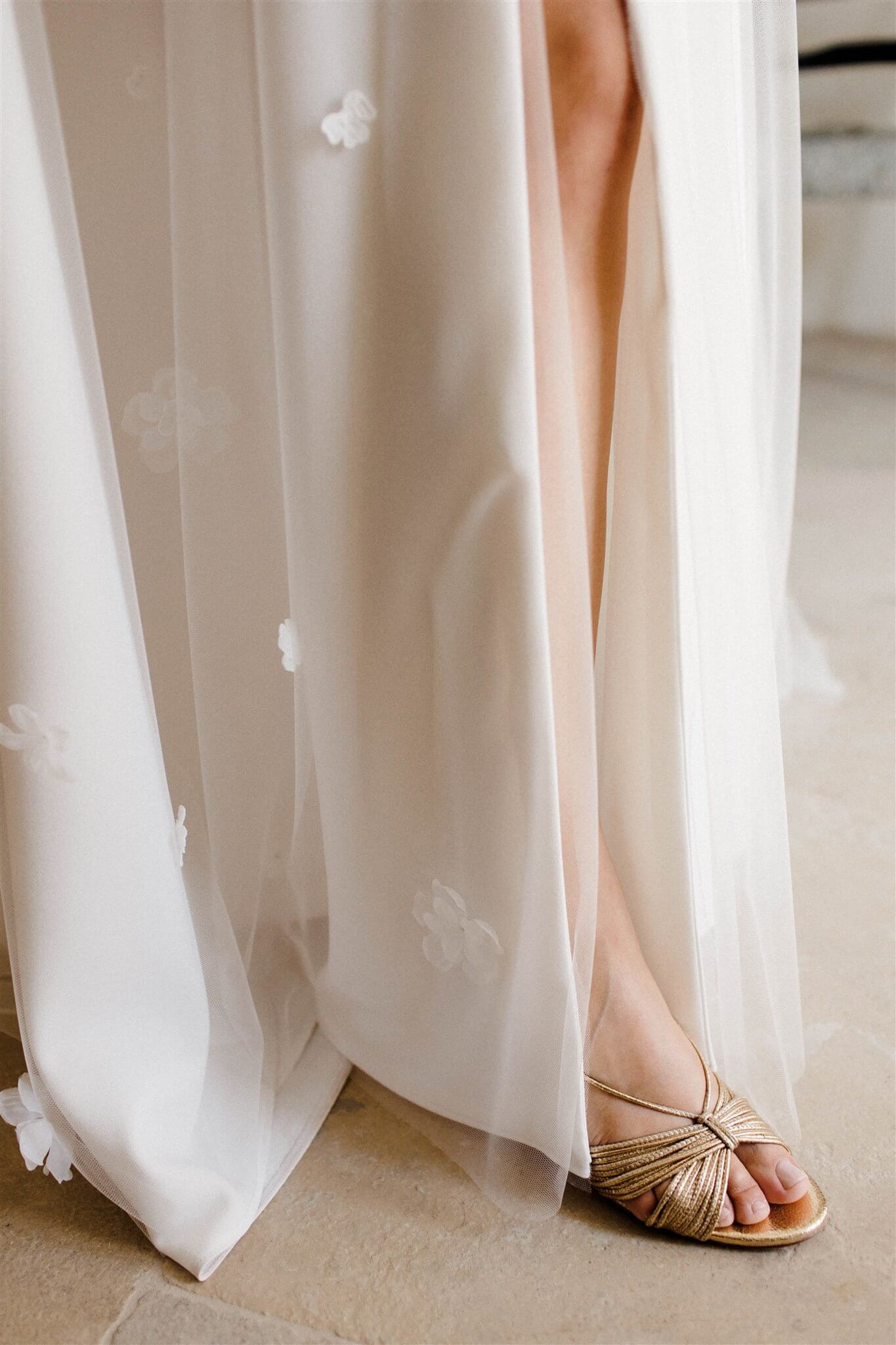 Pour Lucie, la légèreté et le romantisme guidaient chaque détail de sa conception. Son haut fleuri, au dos nu transparent et aux manches vaporeuses, se prolonge en une pluie de fleurs de mousseline tombant sur son bas en tulle délicat. Discret et précieux, un Louis d’or y est caché, porte-bonheur secret qui l’accompagne tout au long de sa journée.