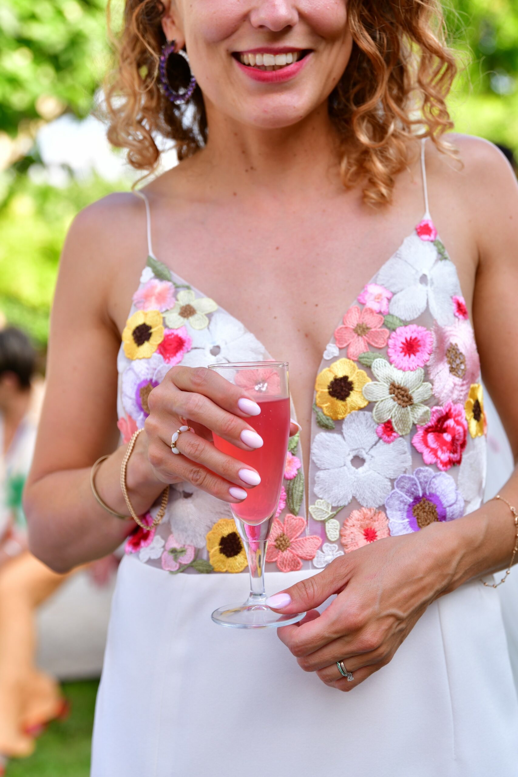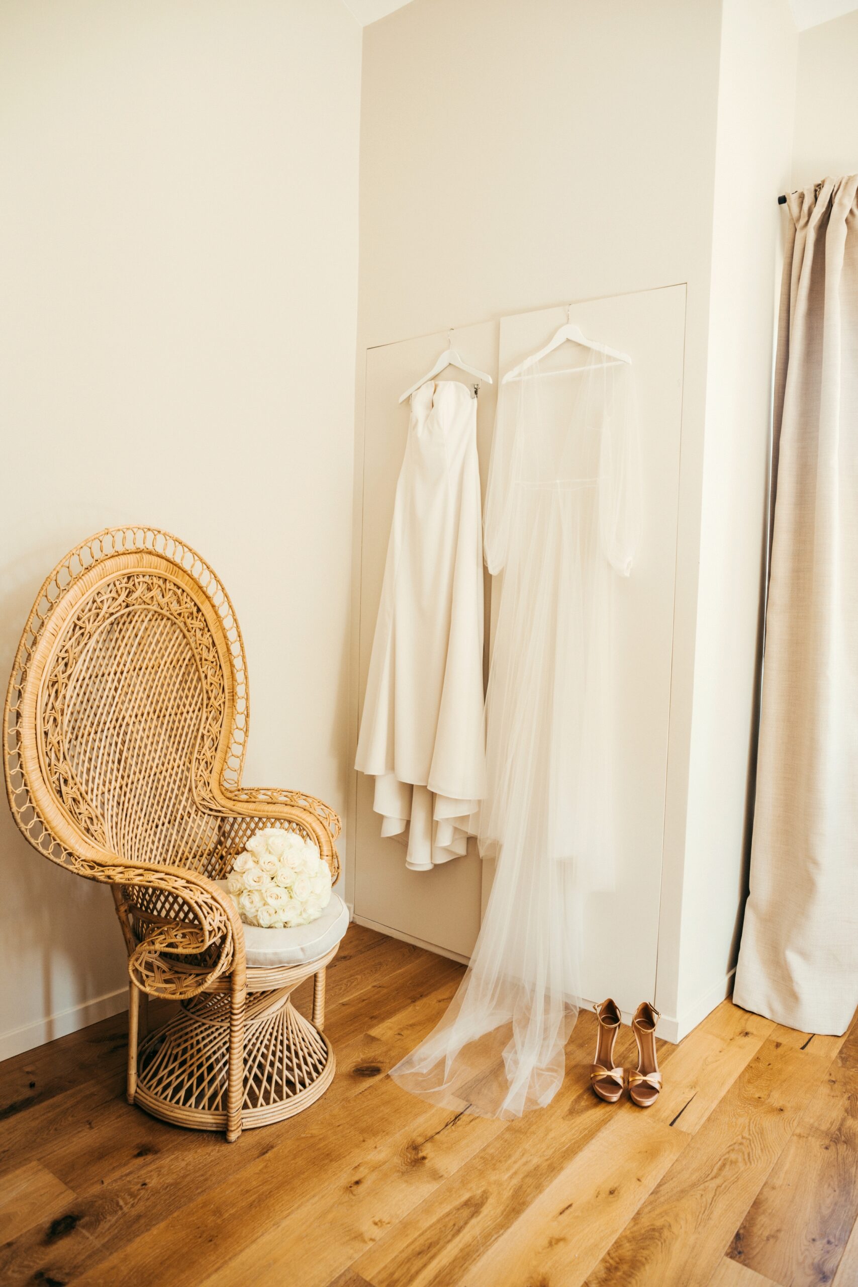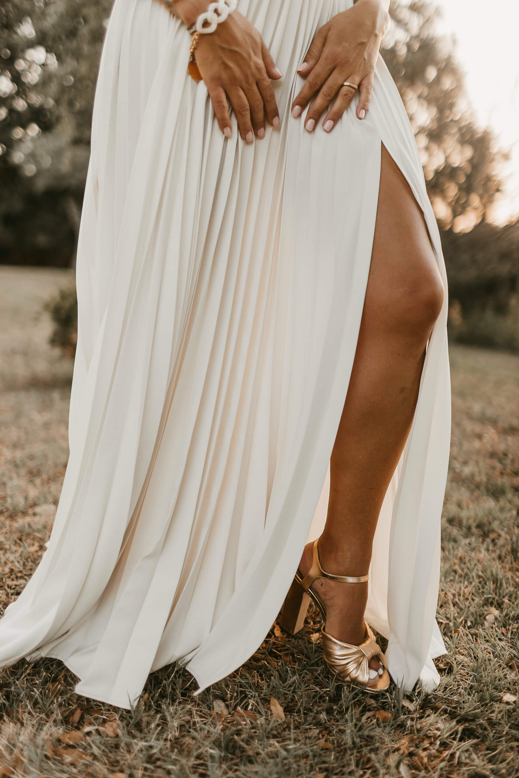 Pour Lucie, la légèreté et le romantisme guidaient chaque détail de sa conception. Son haut fleuri, au dos nu transparent et aux manches vaporeuses, se prolonge en une pluie de fleurs de mousseline tombant sur son bas en tulle délicat. Discret et précieux, un Louis d’or y est caché, porte-bonheur secret qui l’accompagne tout au long de sa journée.