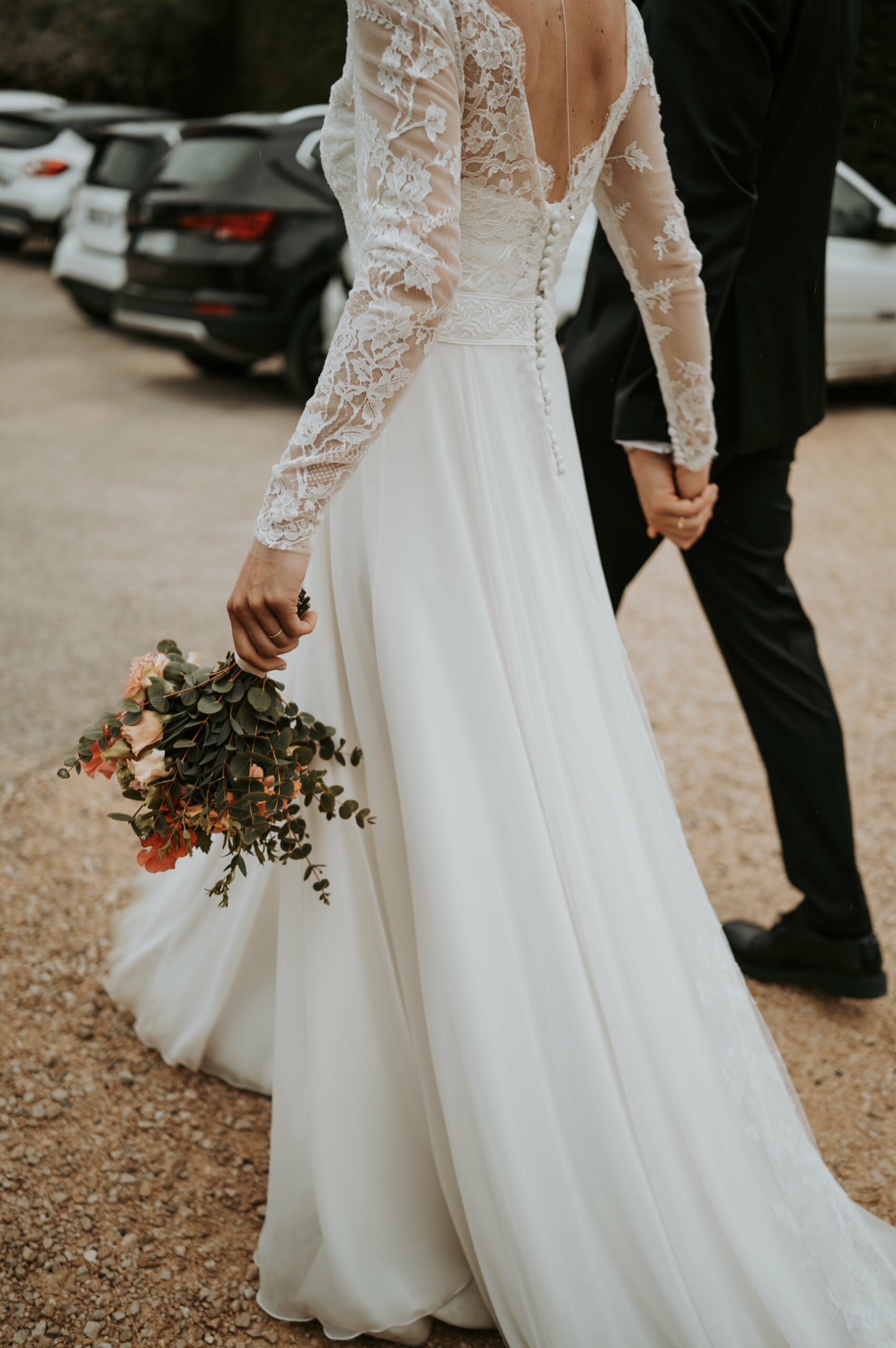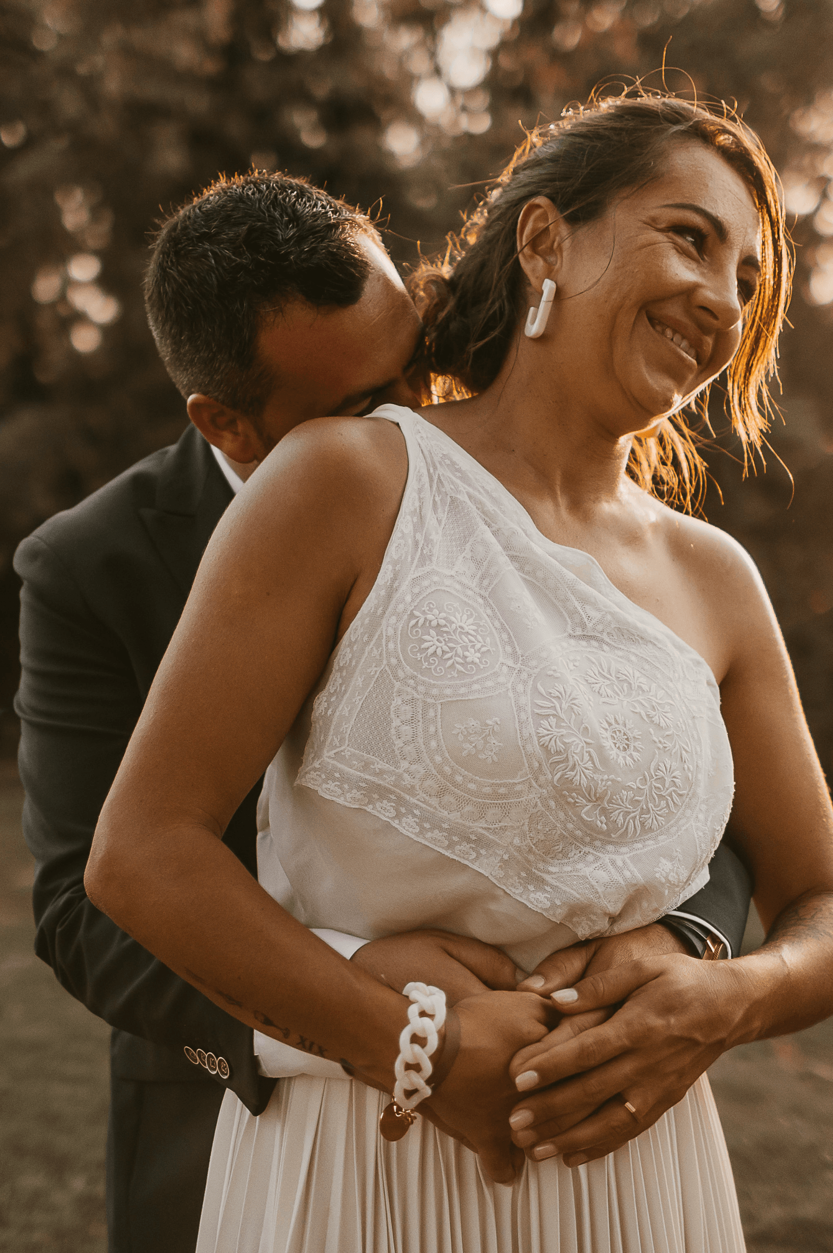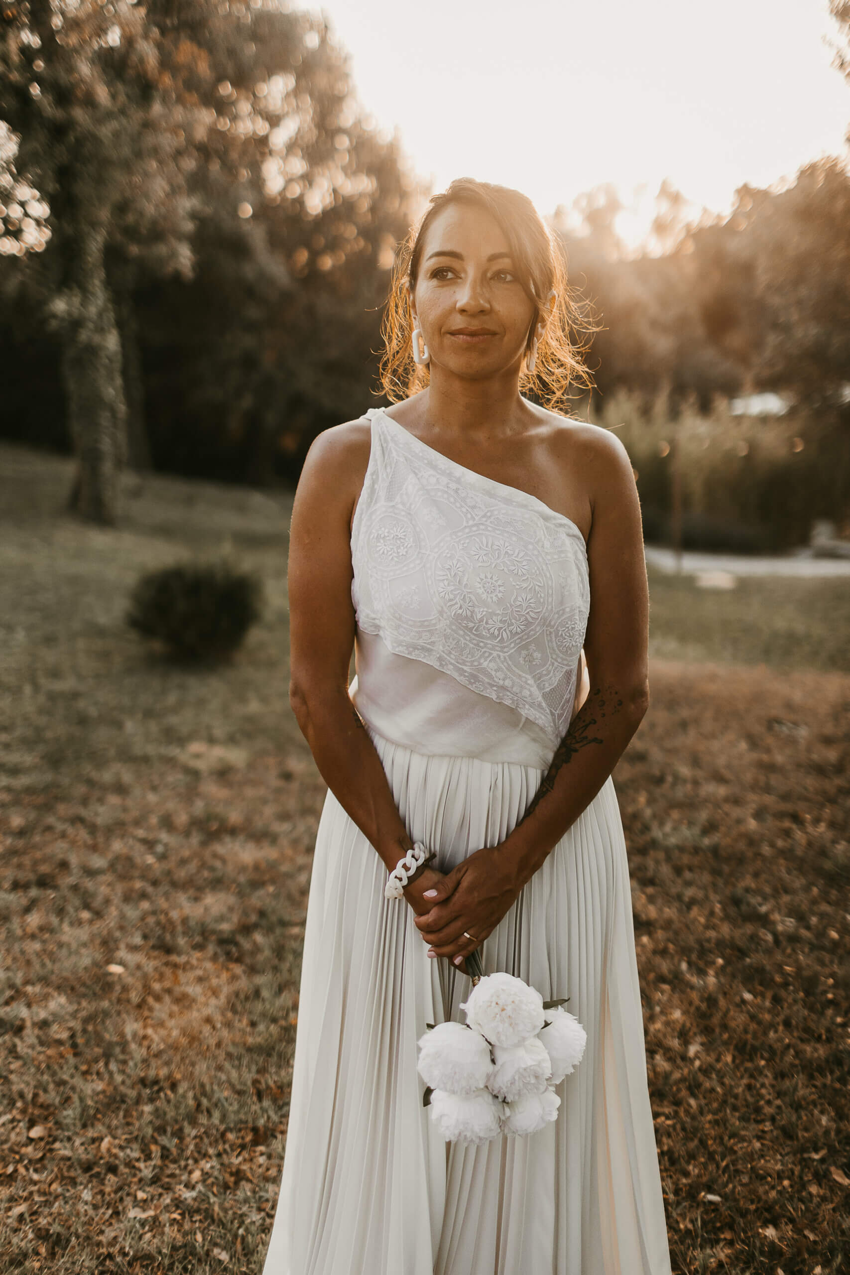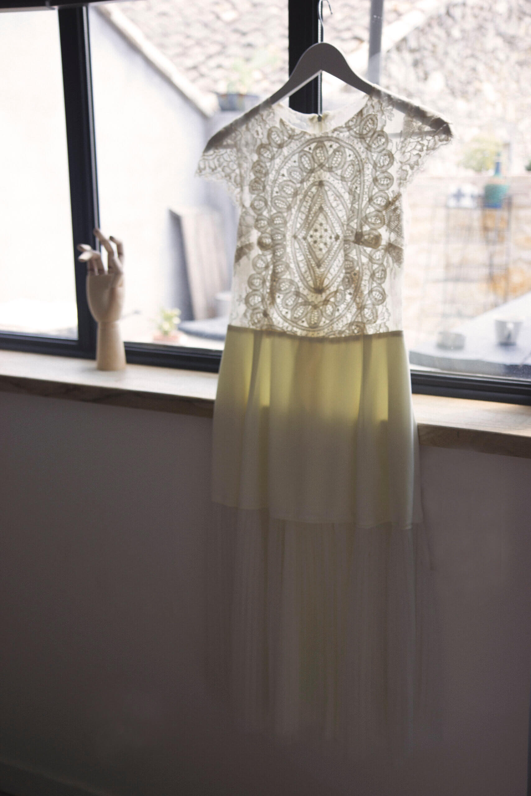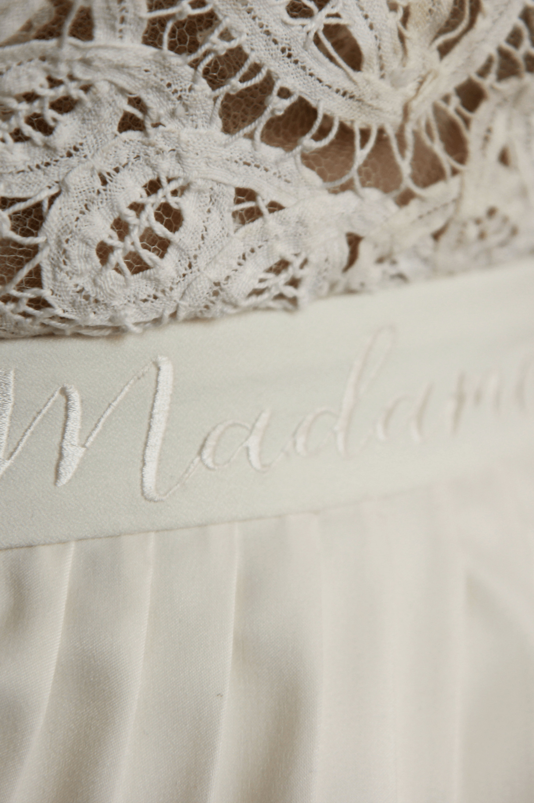 Pour Marie, qui souhait s’éloigner des grands classiques, nous avons travaillé avec notre plisseur parisien pour créer un plissé soleil, sculptant sa jupe, rehaussée d’une broderie, clin d’œil délicat à son mari. Son haut en mousseline de soie, ouvert dans le dos, est sublimé par une dentelle vintage, créant une véritable pièce unique au monde.