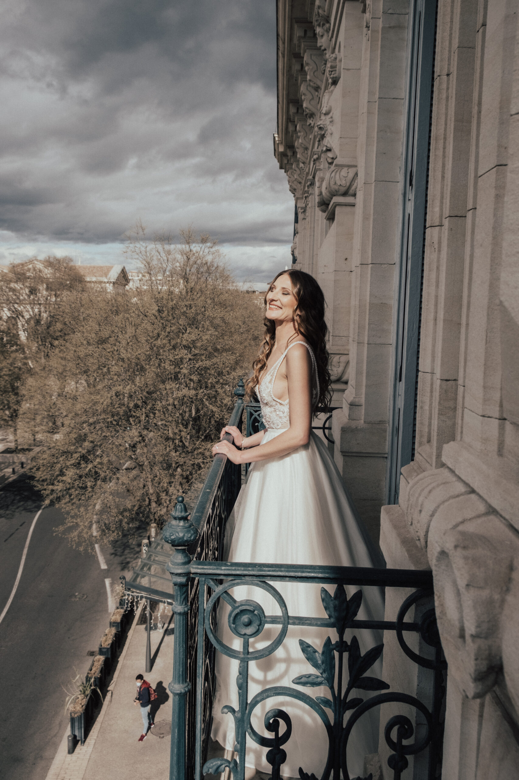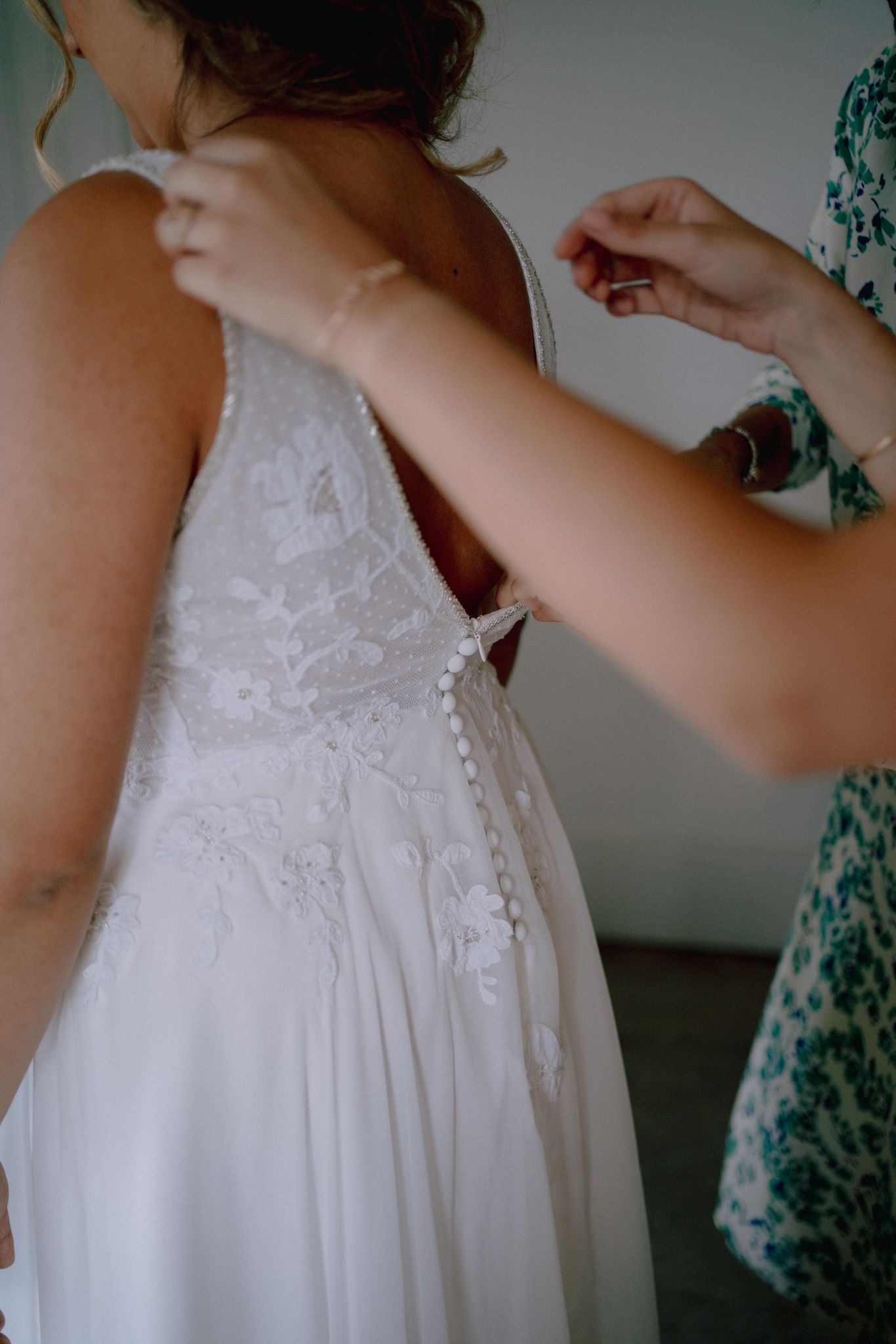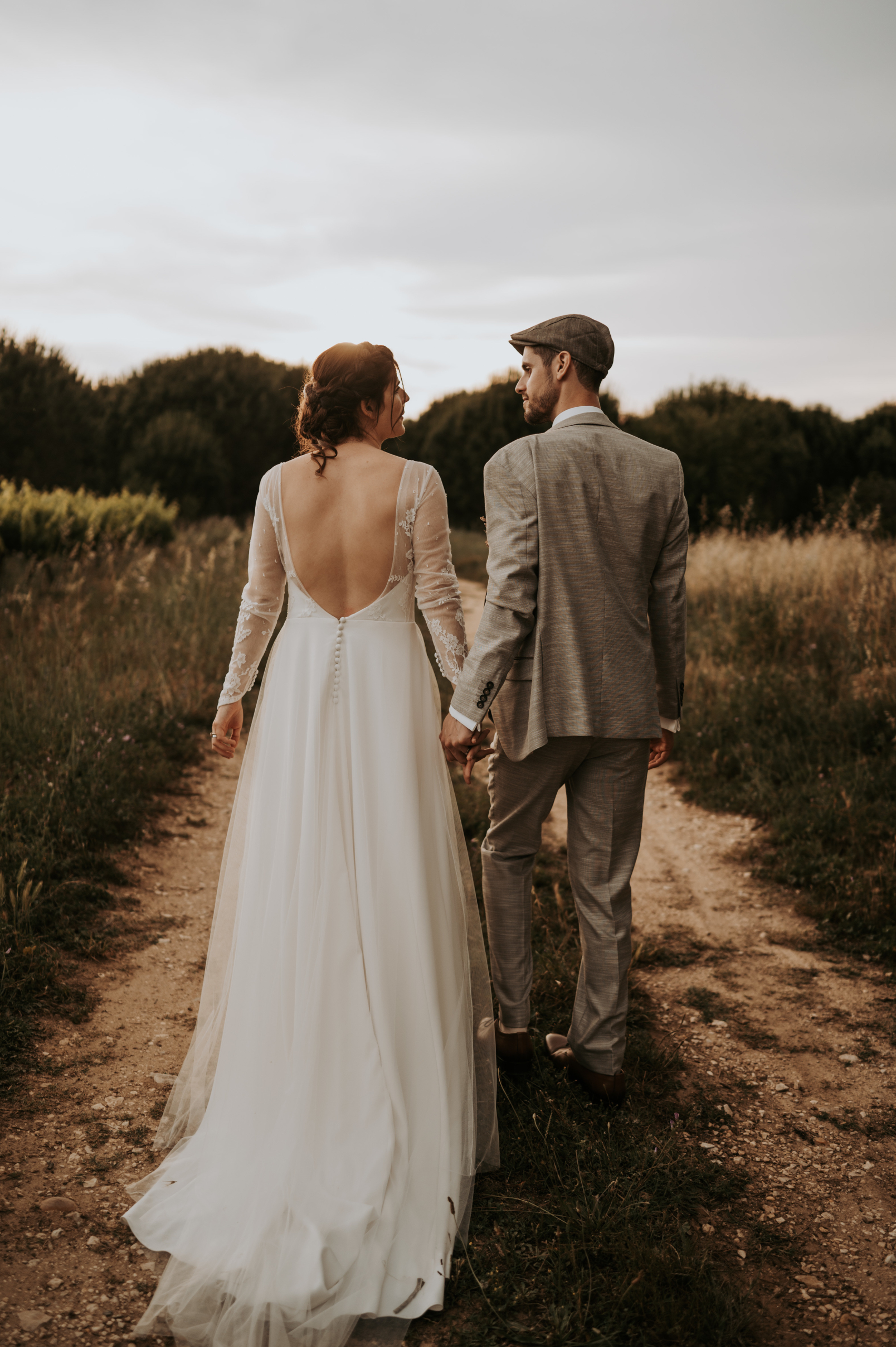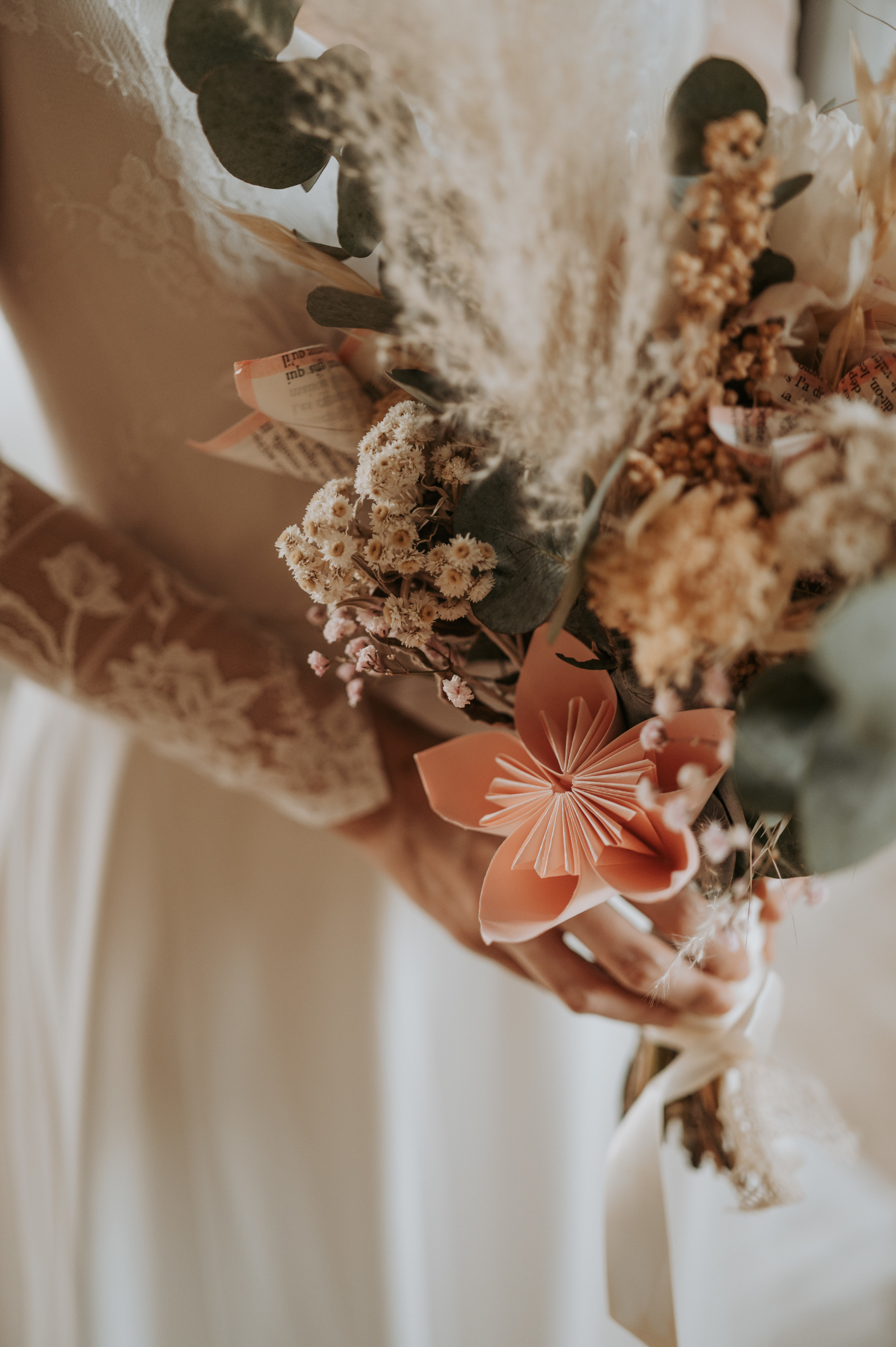 Pour Marie, qui souhait s’éloigner des grands classiques, nous avons travaillé avec notre plisseur parisien pour créer un plissé soleil, sculptant sa jupe, rehaussée d’une broderie, clin d’œil délicat à son mari. Son haut en mousseline de soie, ouvert dans le dos, est sublimé par une dentelle vintage, créant une véritable pièce unique au monde.