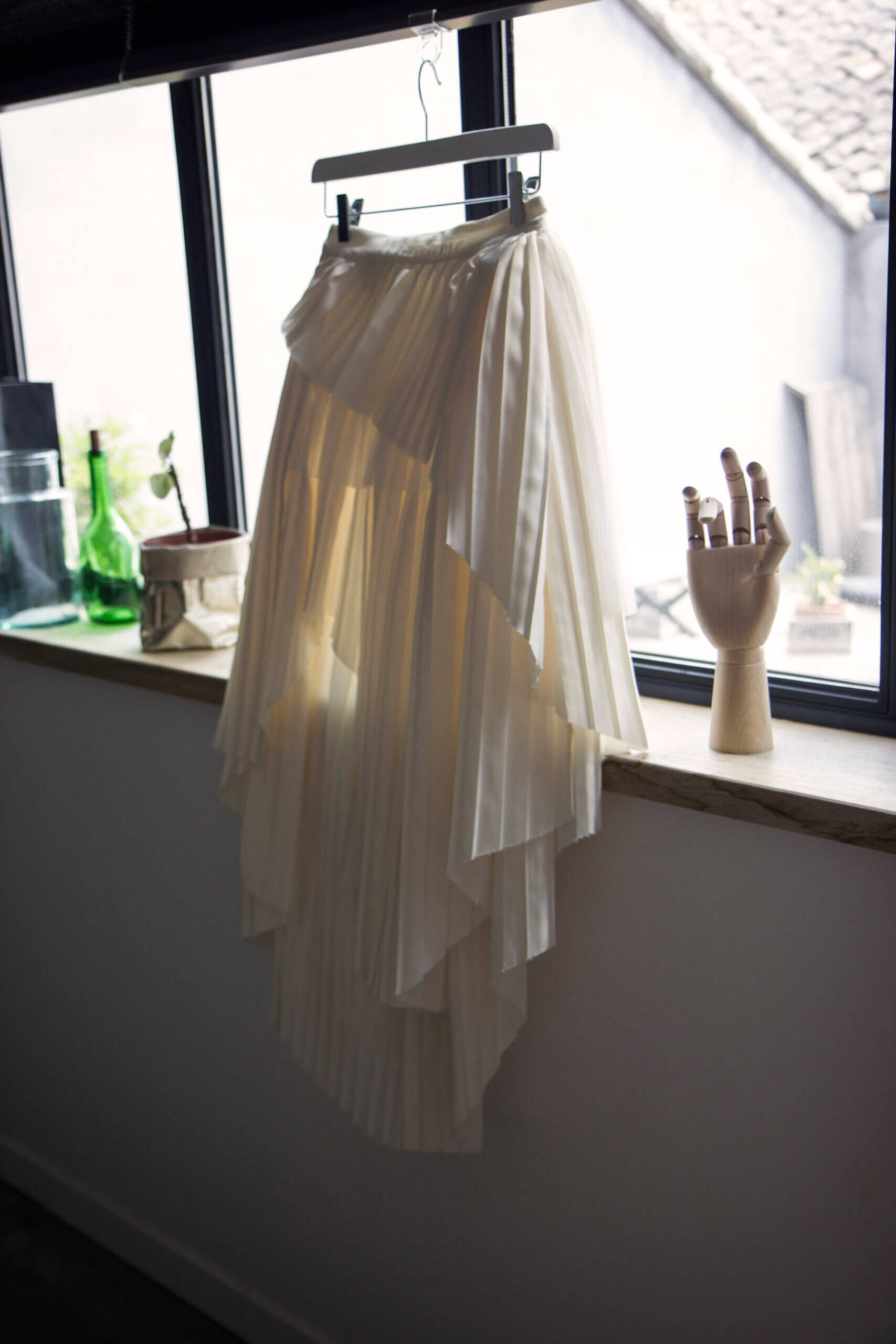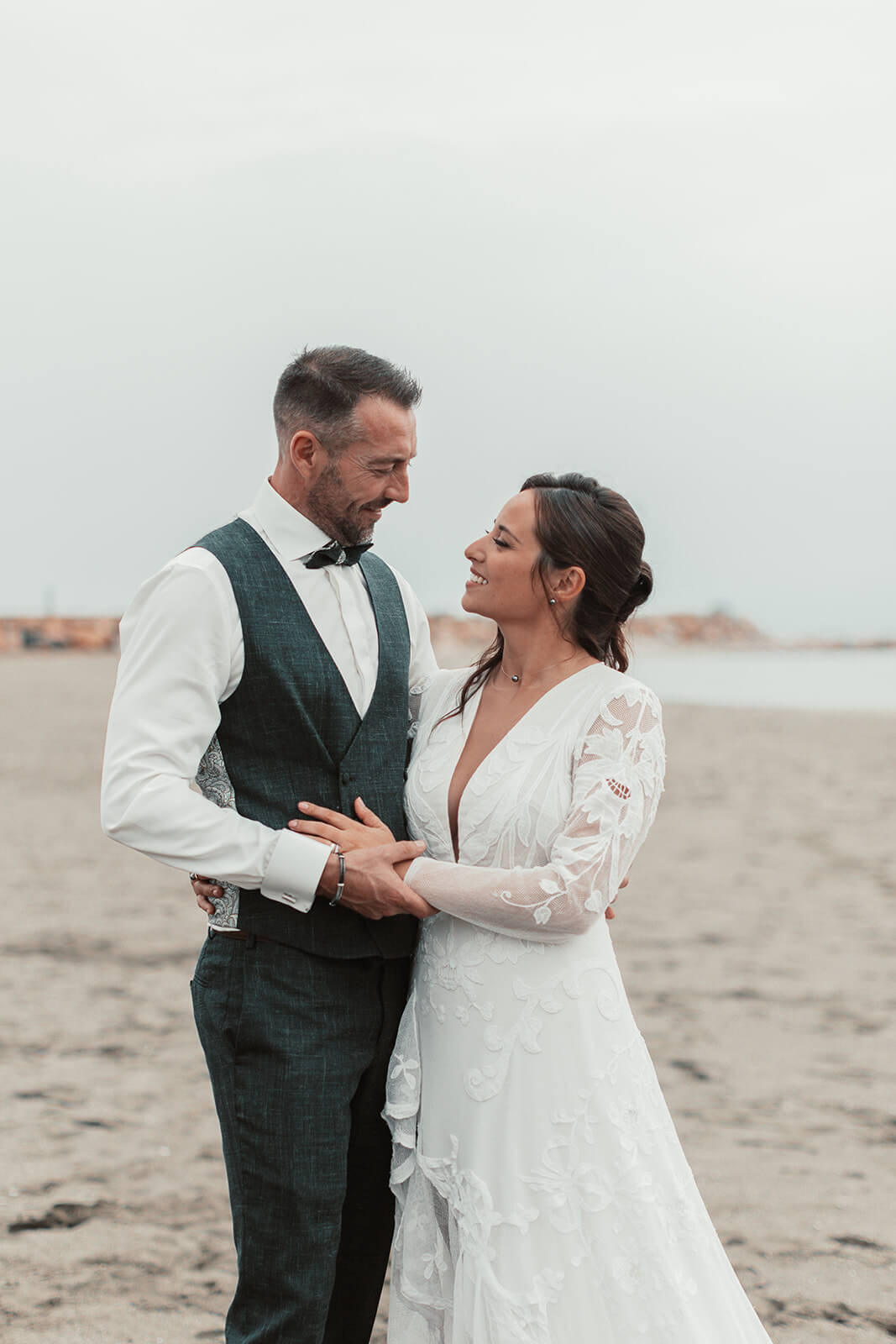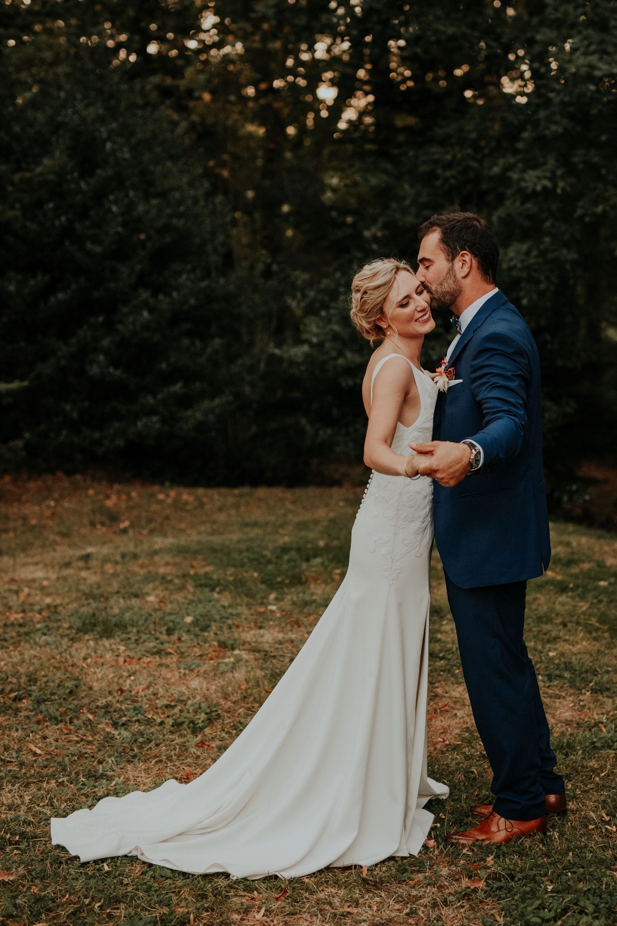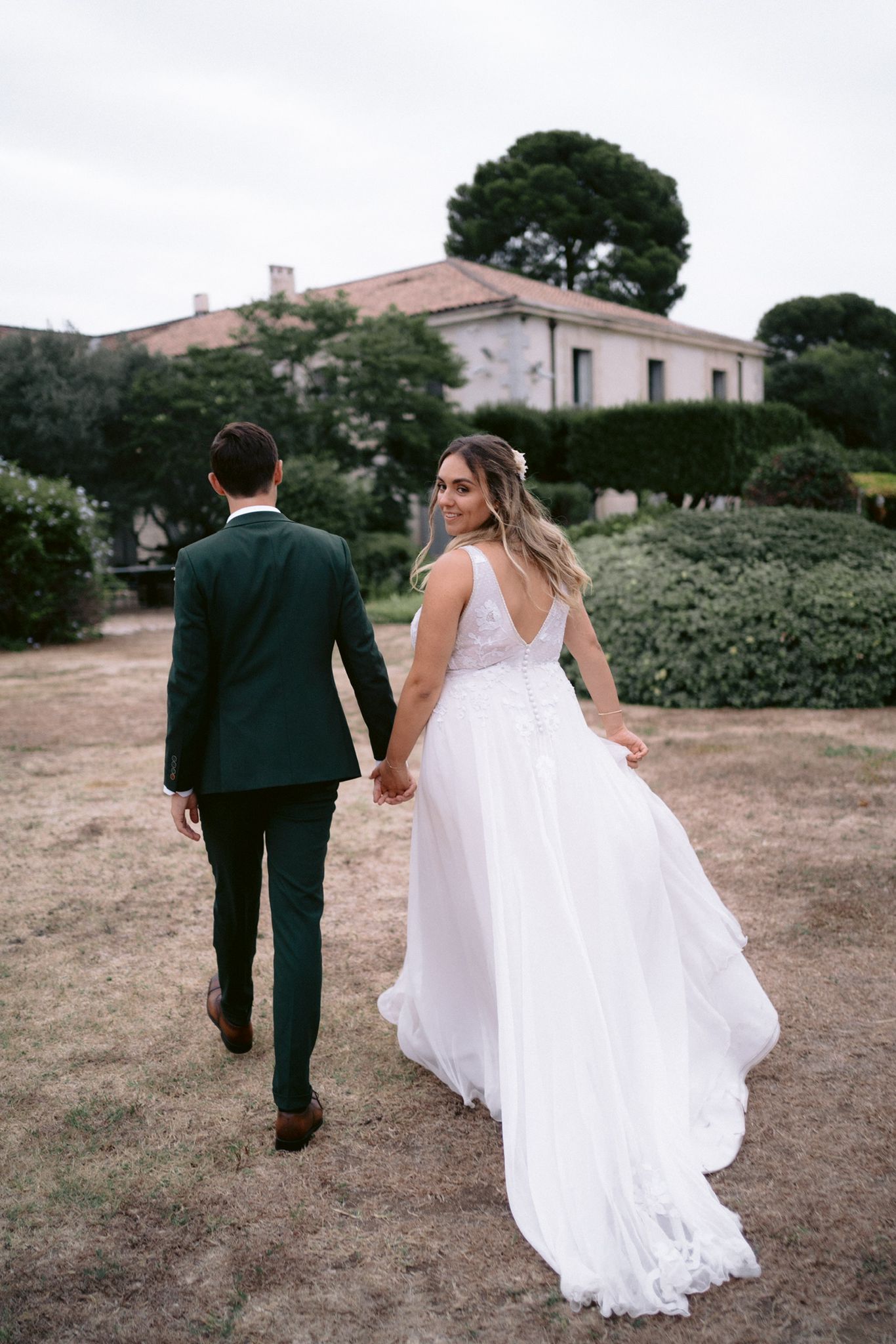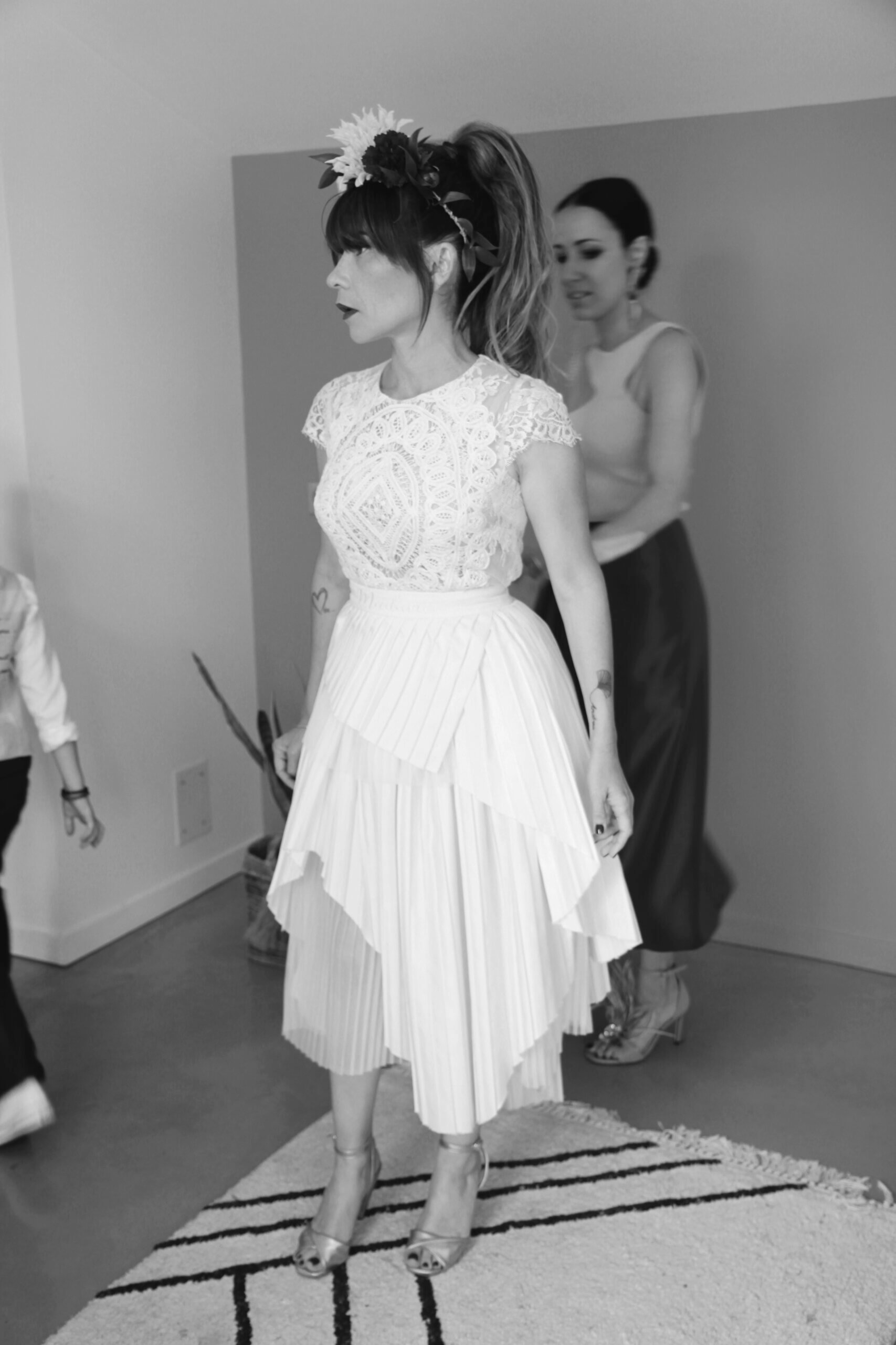 Pour Marie, qui souhait s’éloigner des grands classiques, nous avons travaillé avec notre plisseur parisien pour créer un plissé soleil, sculptant sa jupe, rehaussée d’une broderie, clin d’œil délicat à son mari. Son haut en mousseline de soie, ouvert dans le dos, est sublimé par une dentelle vintage, créant une véritable pièce unique au monde.