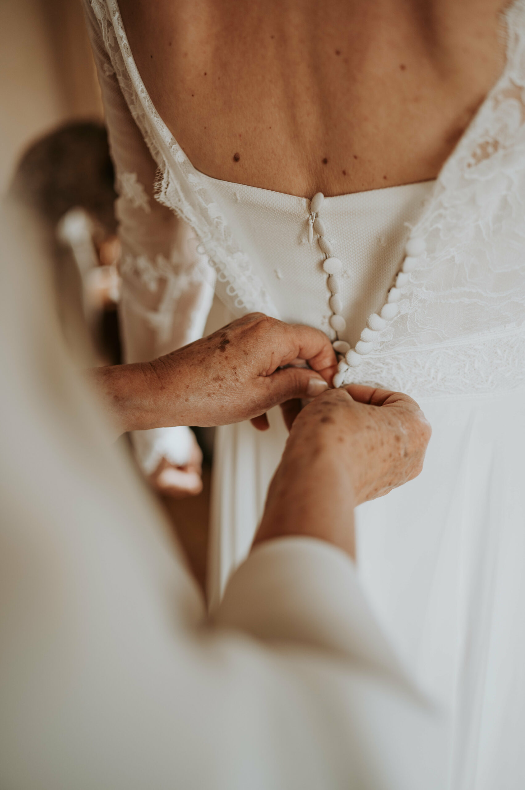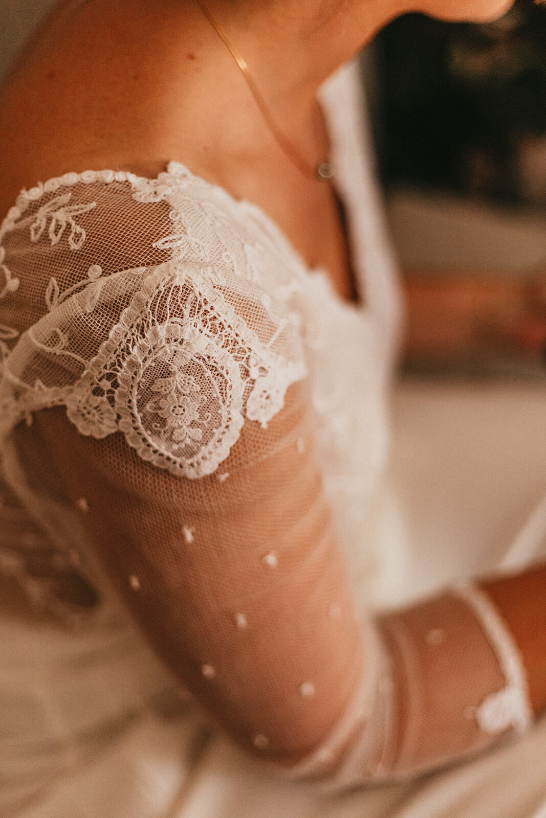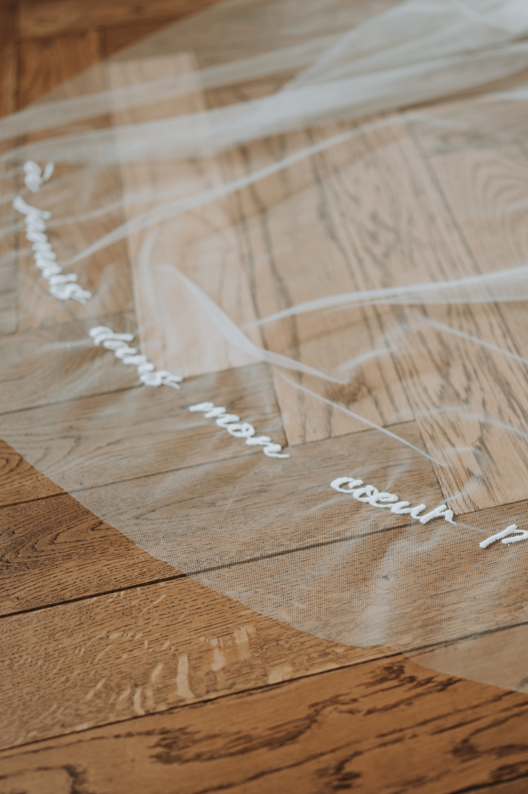 Pour Céline, la délicatesse et le romantisme étaient au cœur du projet. Nous avons conçu un haut aux transparences maîtrisées et aux ouvertures subtiles, ponctué de fleurs de mousseline qui s’épanouissent en cascade sur son bas en Tulle. Enfin, son voile créé et brodé par nos soins portait un message en hommage à son père.