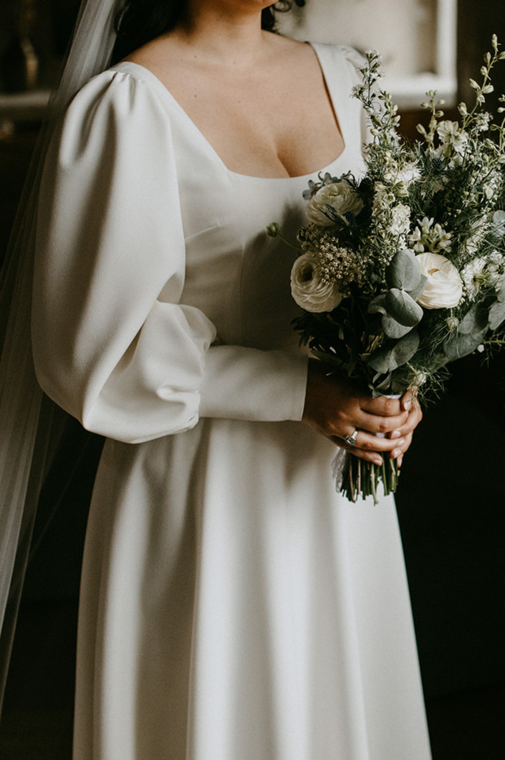 Loretta a choisi une robe en Crêpe aux lignes pures et modernes, avec corseterie intégrée. Pour amener une touche de douceur et de romantisme à sa cérémonie, nous avons créé une longue sur-robe en Tulle fin Italien entièrement amovible pour la soirée.