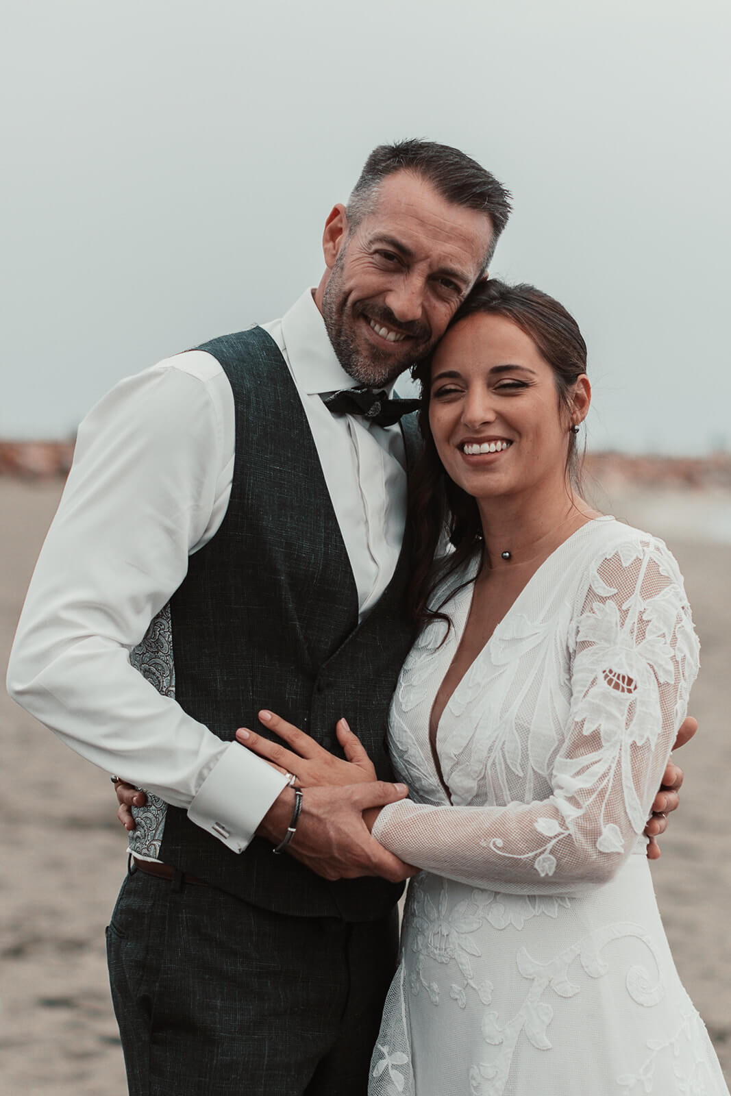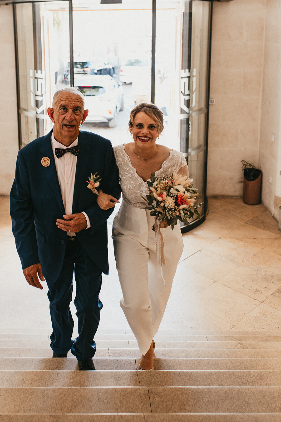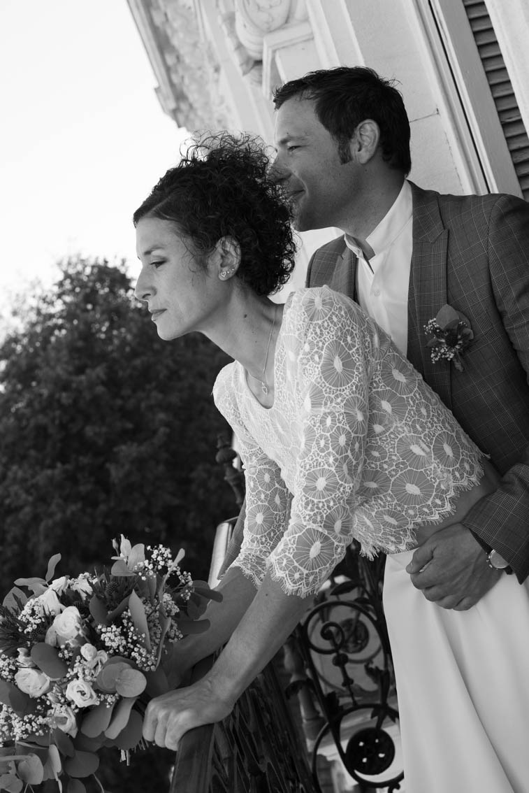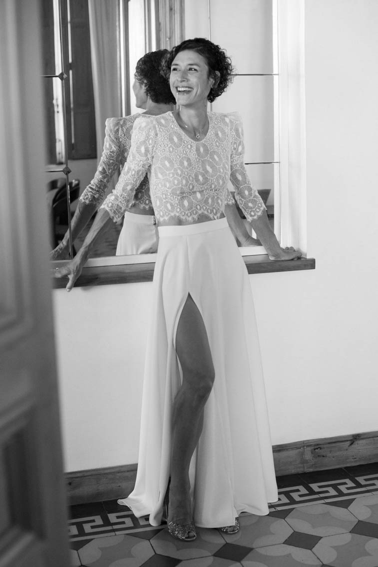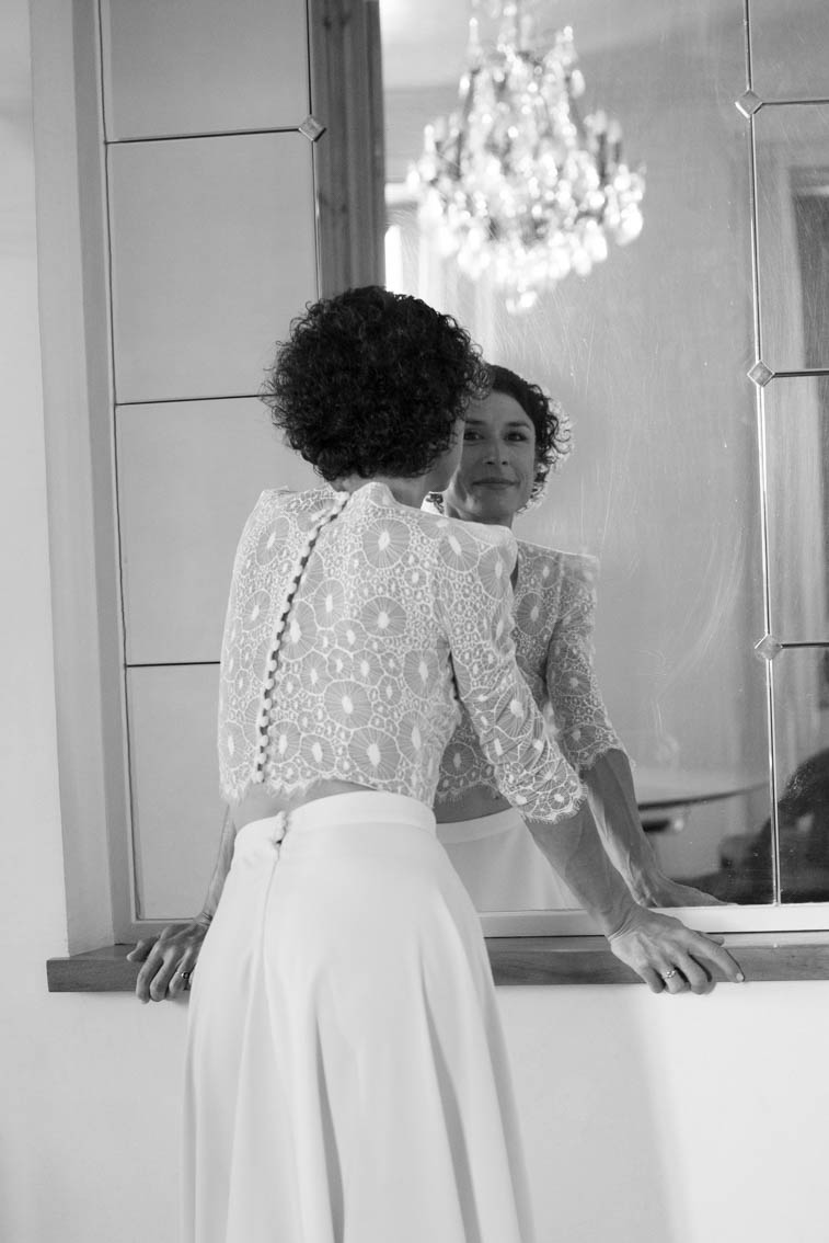 Karine hésitait entre modernité, romantisme et audace. Nous avons donc imaginé 3 tenues à partir d’une pièce maîtresse : Un body somptueusement rebrodé de Dentelles de Calais, de perles de verres et de nacres auquel nous somme venu créer un tailleur pantalon pour la mairie, remplacé par un long bas de robe ainsi qu’un voile en Tulle Italien pour la cérémonie et enfin, une jupe fourreau en Crêpe pour la soirée, révélant tour à tour toutes les facettes de sa personnalité.
