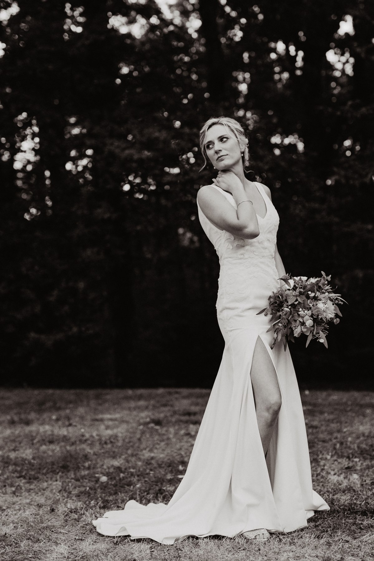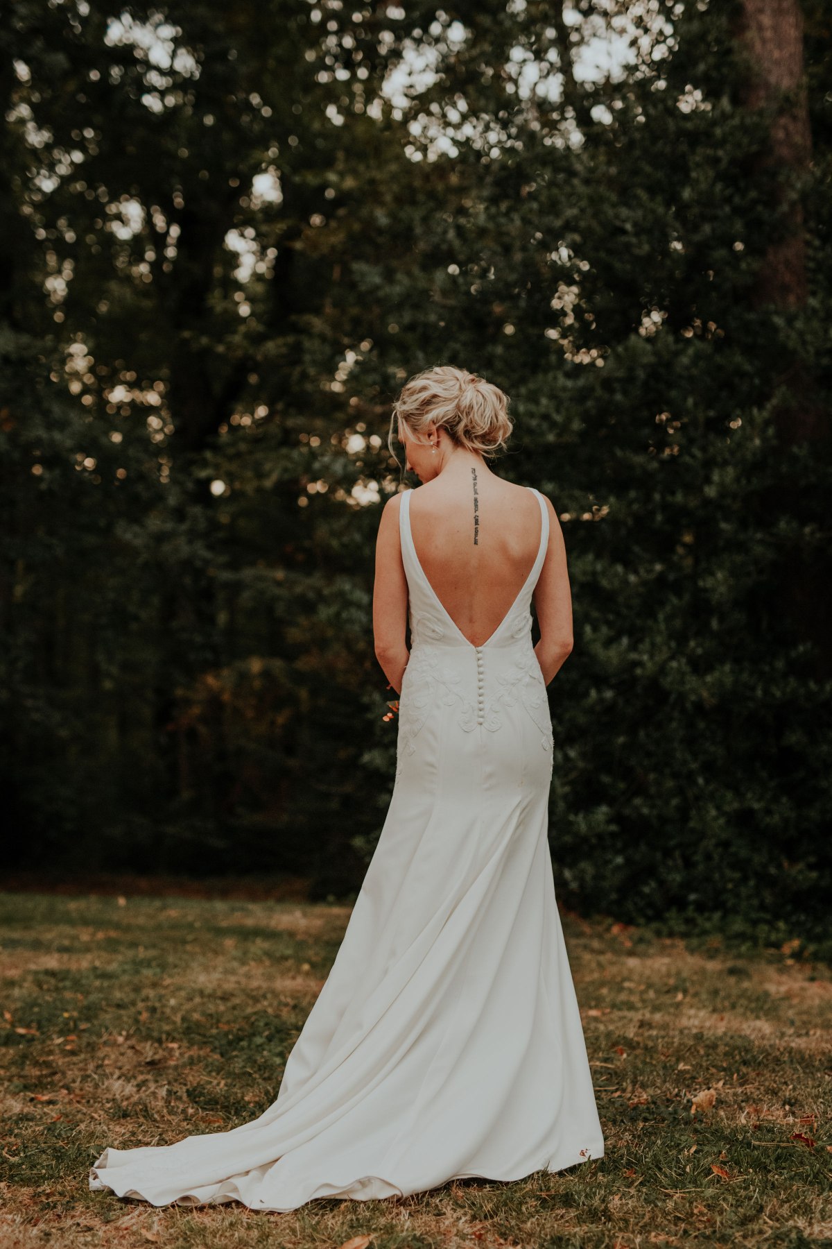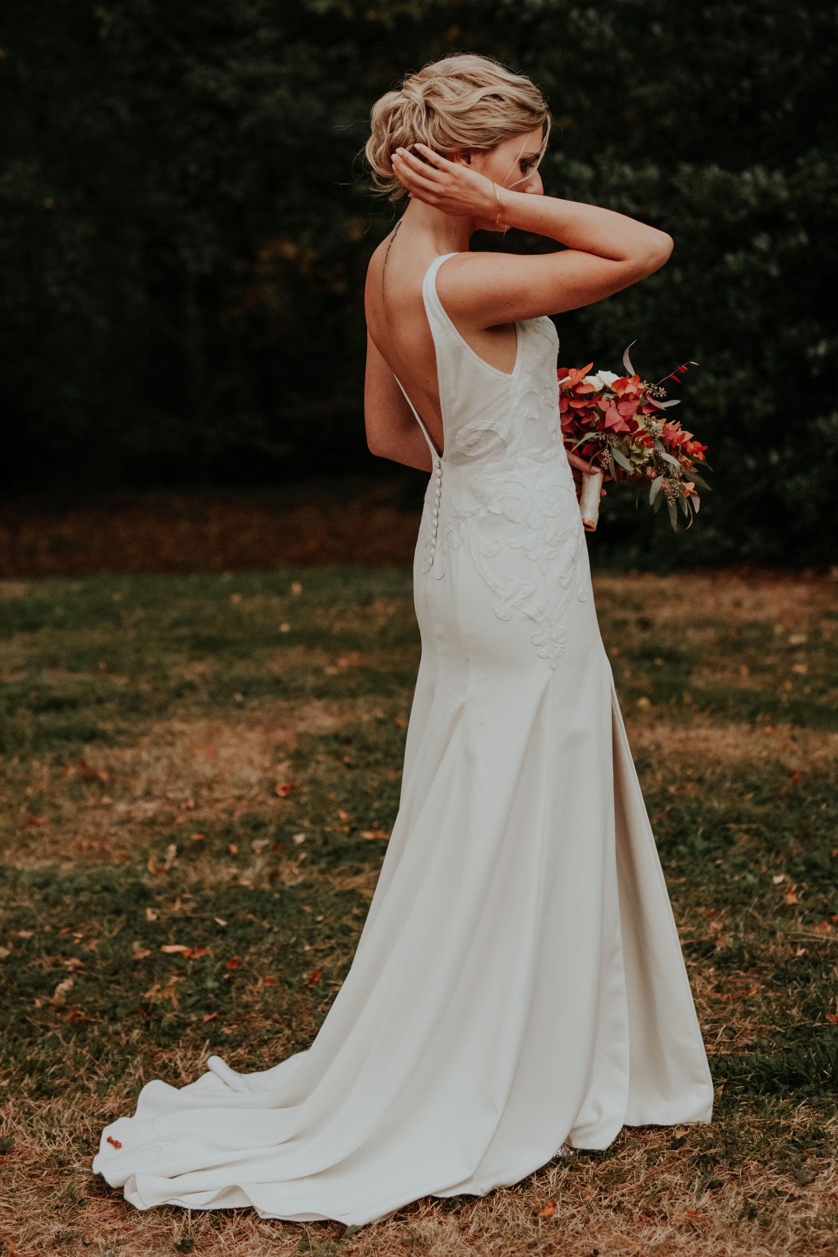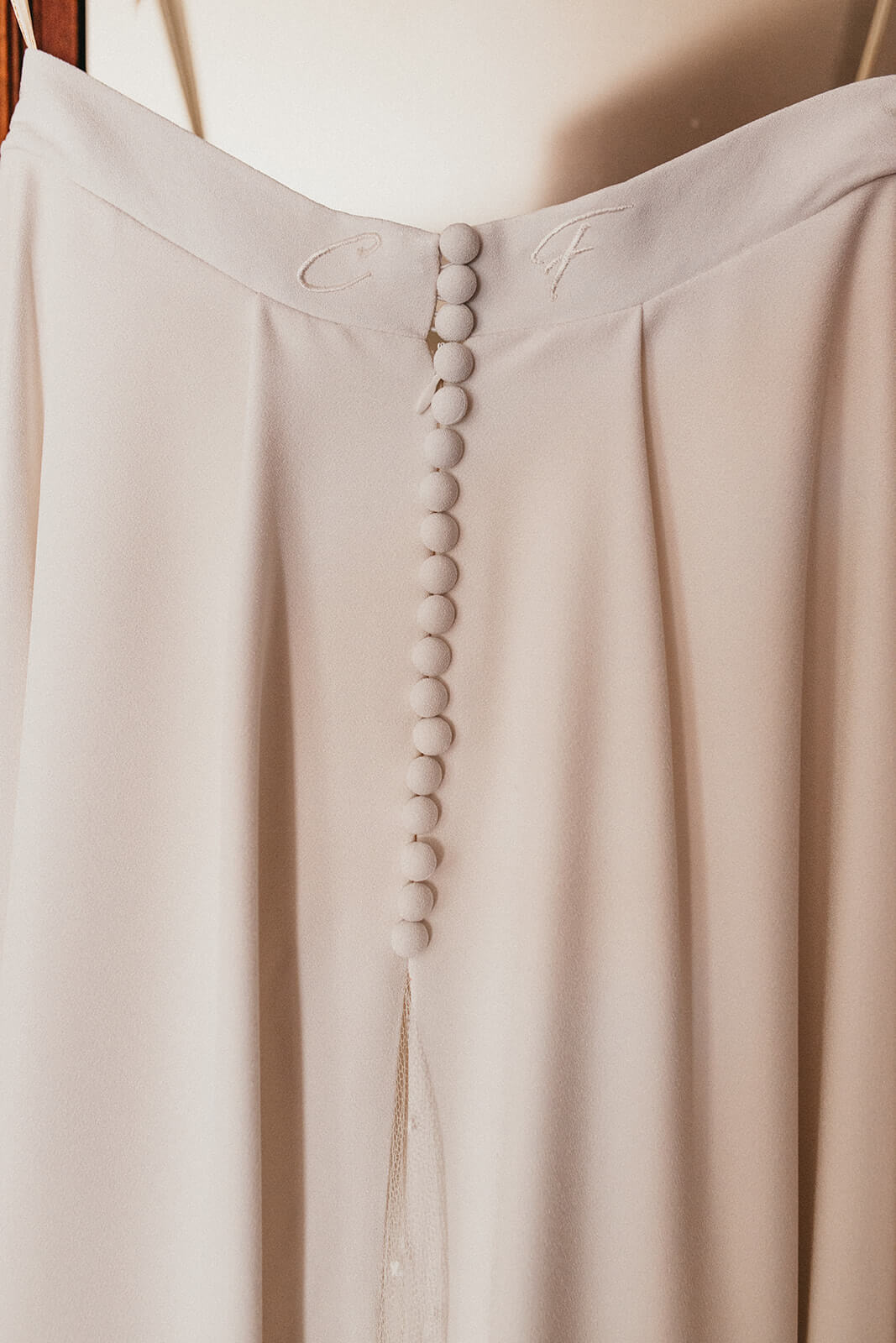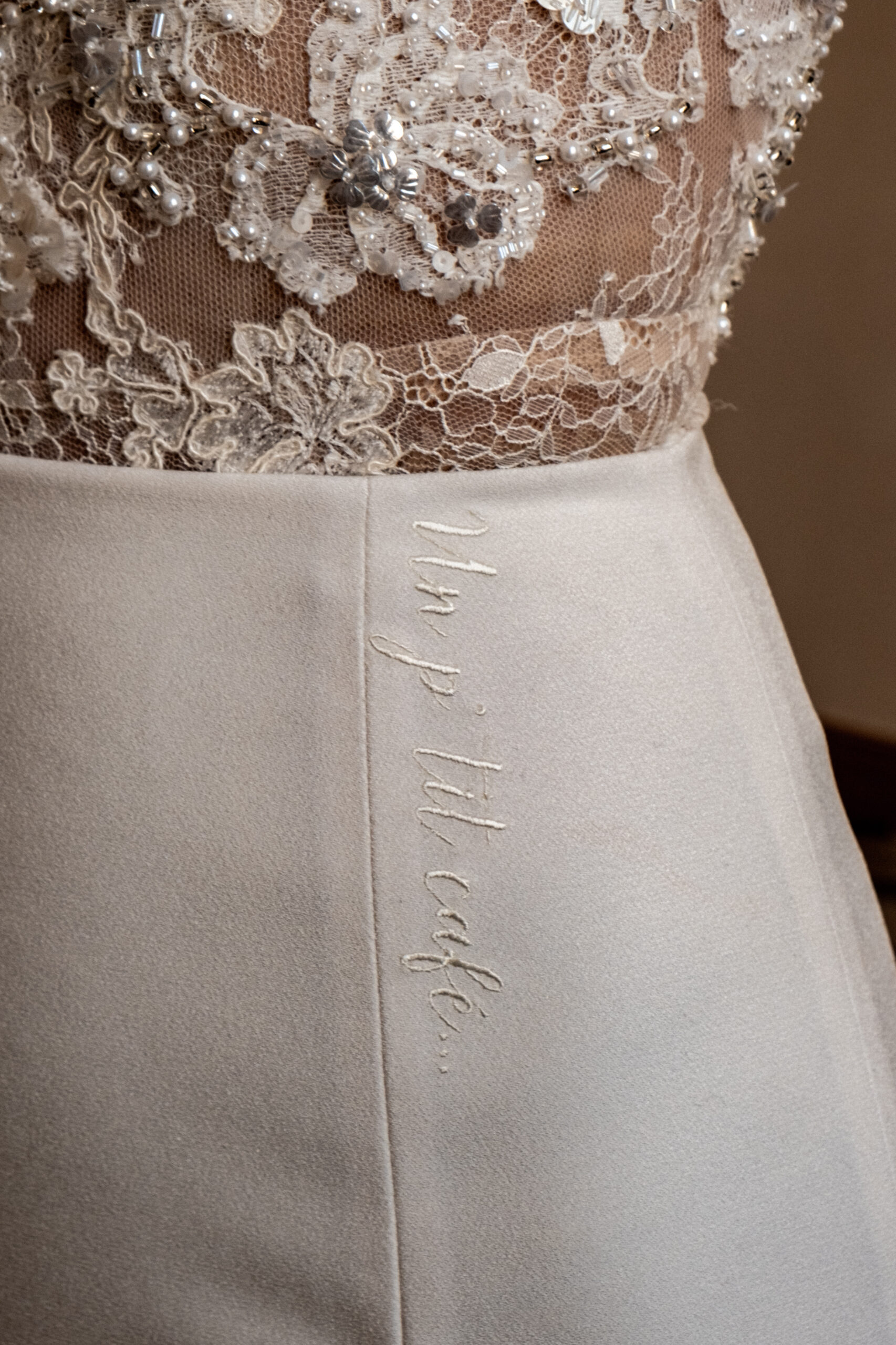 Christina rêvait d’une robe minimaliste et intemporelle et pour lui donner un caractère unique, nous avons sélectionné les motifs d’une broderie vielle de 120 ans, restaurés puis appliqués délicatement sur son haut et sa traîne.