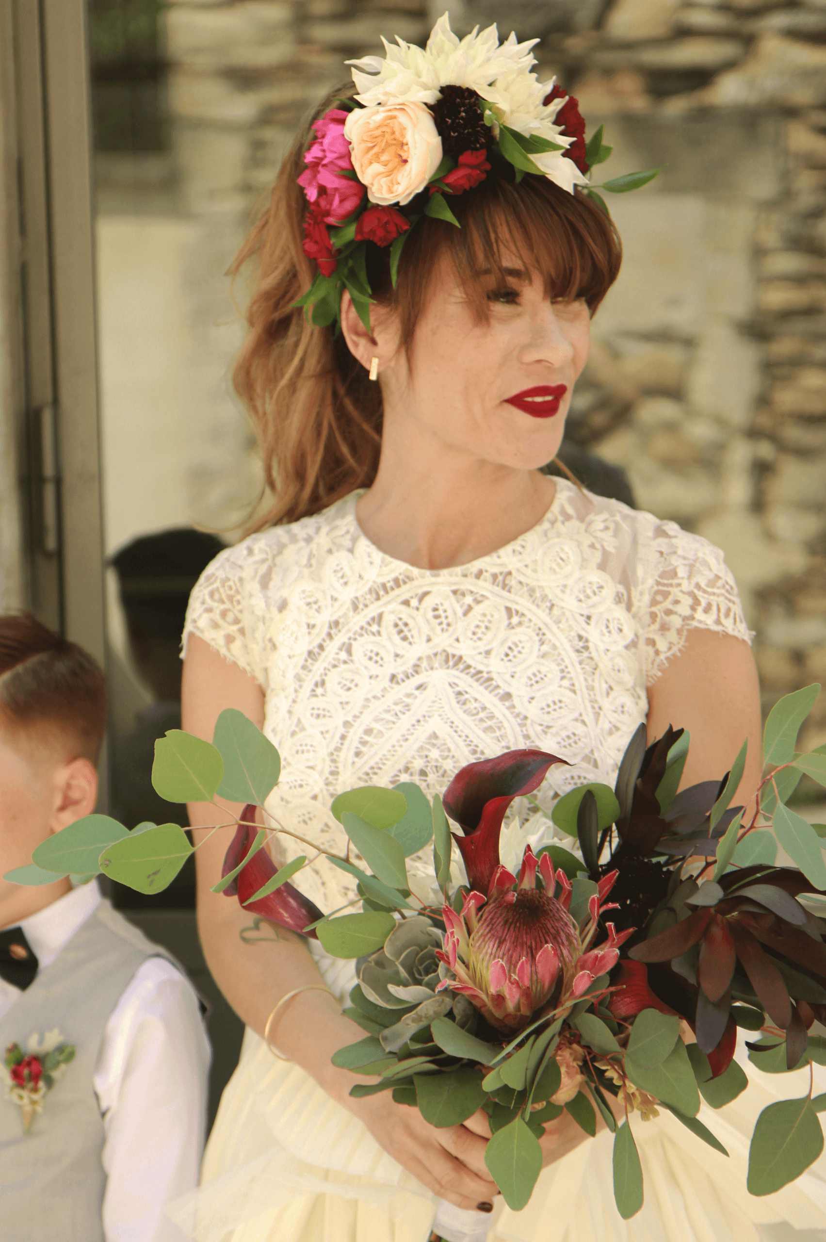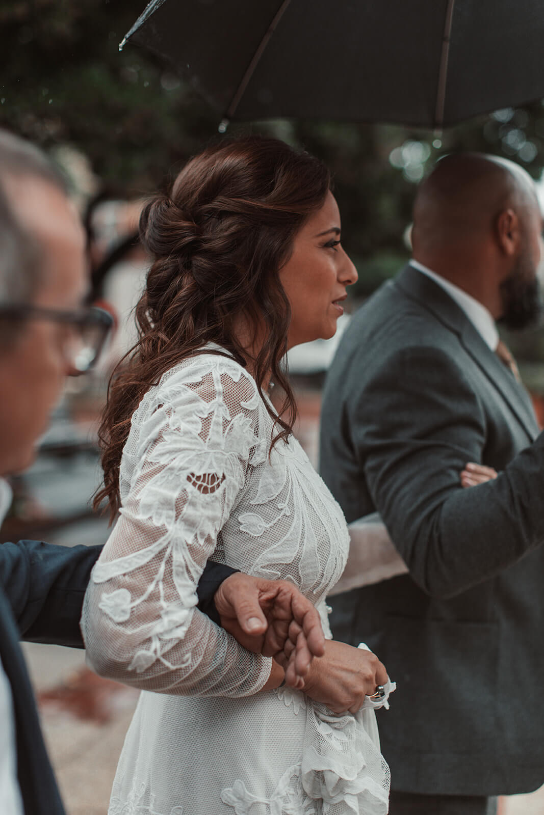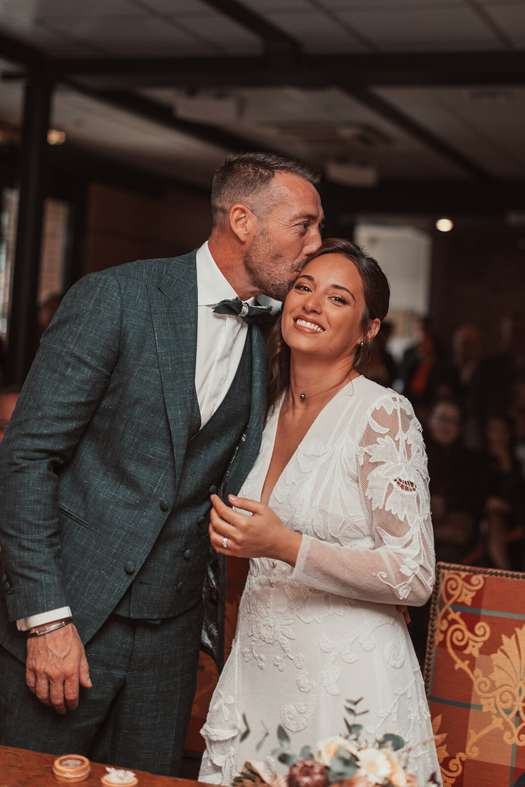 Audrey s’est distinguée en choisissant une dentelle de Lyon pour sublimer sa robe. Ce trésor du savoir-faire français, rare et préservé en un seul lieu au monde, habille avec délicatesse ses décolletés audacieux, ses manches aériennes et sa longue traîne. La pureté de sa coupe crée un équilibre parfait entre tradition et modernité.